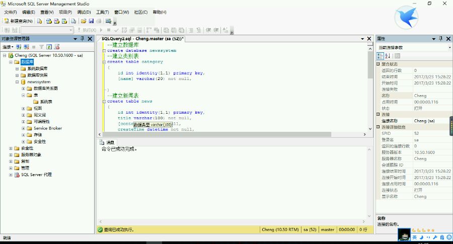 然后建表的时候没有加上use 数据库名,就会直接建在master数据库里,当然不加use master也可以,左上角执行键旁边的小框选刚刚新建的数据库名字就行了