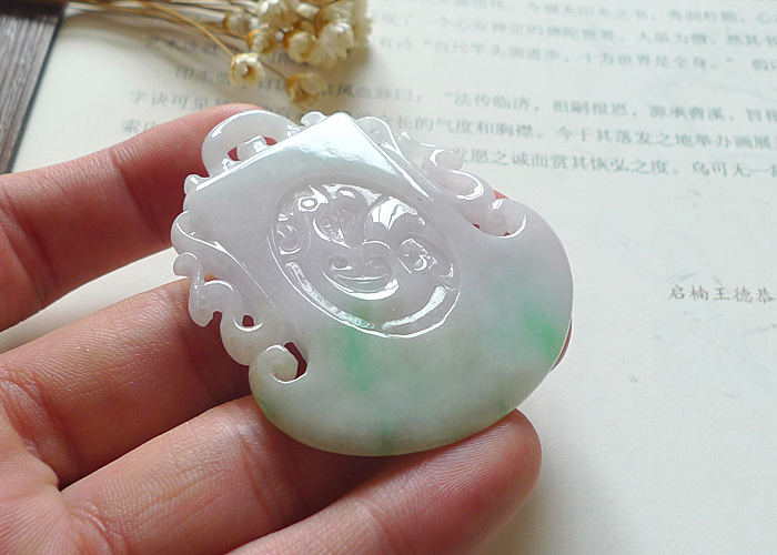 【名称】-缅甸天然翡翠A货阳绿斧上有龙(4238)【尺寸】-56.3*46.5*.4.2mm【重量】-21.8g【价格】-398元【简介】- 无纹裂,种水好,玉质细润,飘阳绿,寓意好。