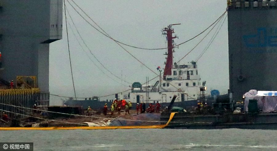 位于韩国全罗南道珍岛郡附近海域的“世越”号沉船打捞现场传出消息称,“世越”号沉船24日被打捞至移动所需高度,并被牵引至运送其靠岸的半潜船所在水域。25日凌晨,半潜船开始排水起浮。25日晚,锈迹斑斑的船体整体出水,这也标志着“整体抬浮”这一打捞作业中最关键也是最困难的阶段取得成功。