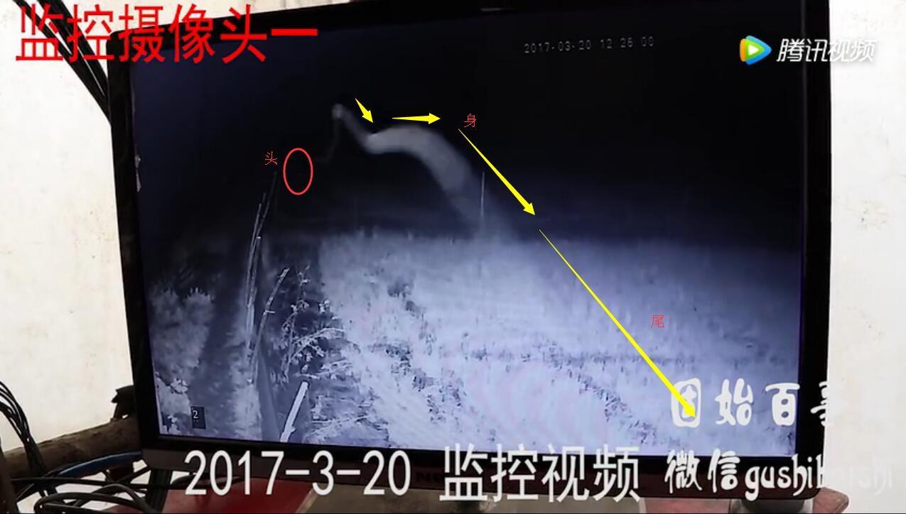 云雾中的长条生物,有人说是蜘蛛丝,但3个监控有那么凑巧都拍到,还能是蜘蛛丝么?而且监控2有蛇头显现。移动轨迹,从1到2,2抬头1秒钟,可以估计这物体在监控1半空飘到监控2然后抬头,这时间持续5分钟左右,监控2拍抬头是晚上12点28分。之后又飘到监控3,此时已经是12点51分。