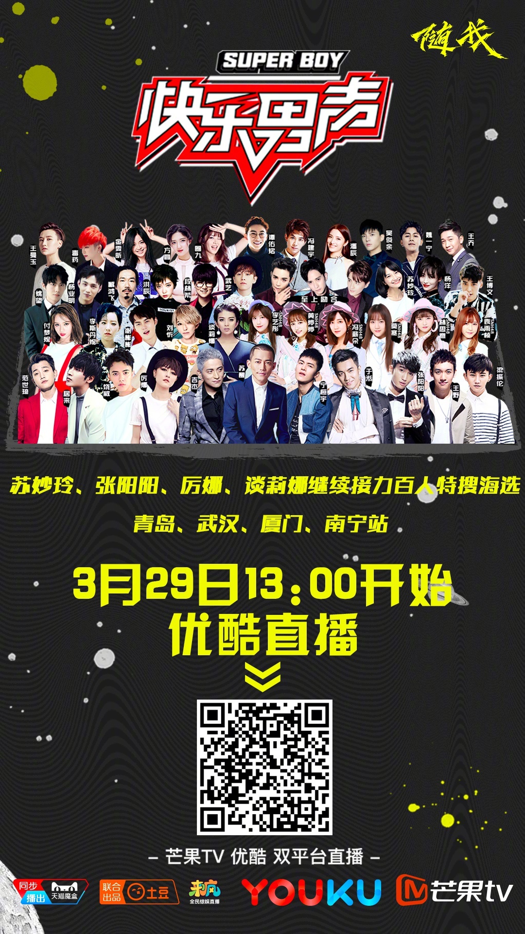 百人特搜海选厦门站 3月29日15:00曾厝垵 3月30日15:00厦门大学城 随厉娜一起搜寻最别样的快乐男声 直播链接:芒果TV →http://www.mgtv.com/v/2017/klns/ 优酷 →http://vku.youku.com/live/play?id=11814 一起来刷弹幕吧!@快乐男声官博