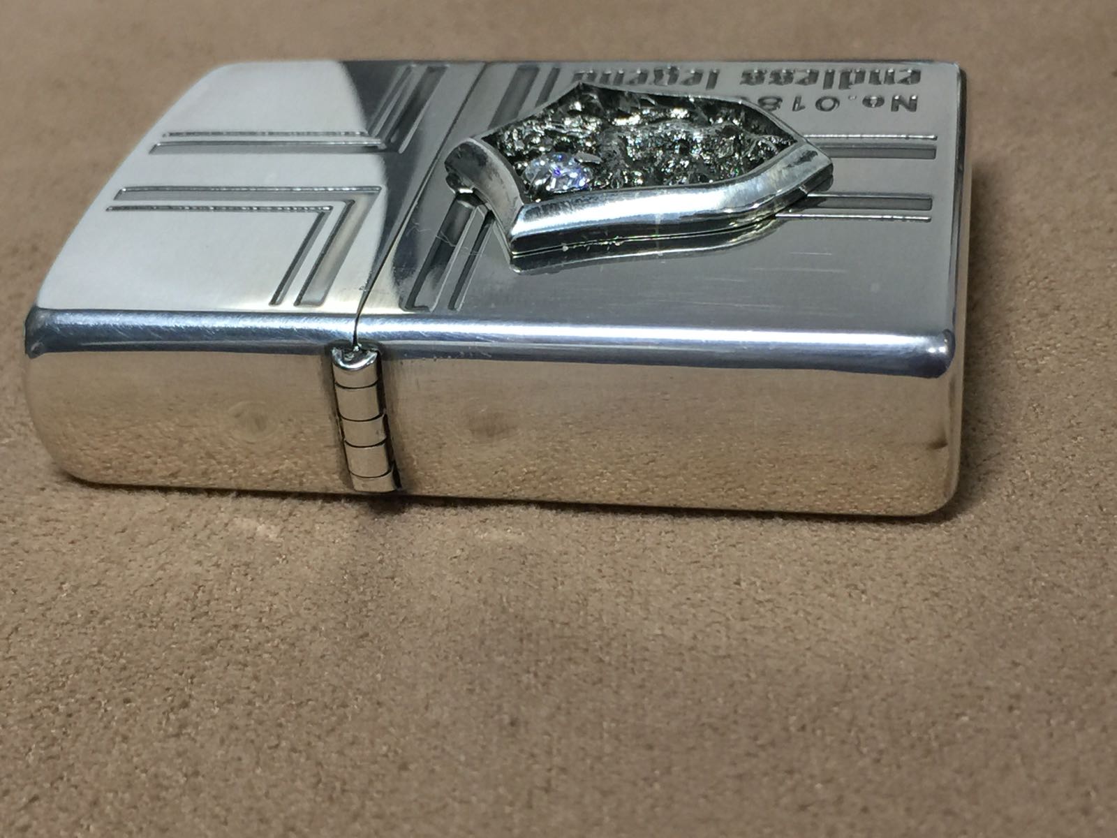 【具体描述】全新2002年 ENDLESS LEGEND(题材未知 字面翻译是无尽传奇)限量套装,本套编号0180,套装含合金烟灰缸一个。机身镀银底板蚀刻+精美狮鹫贴章,贴章内爪镶了一颗水钻,工艺复杂。本机未使用,运输不当,较多擦丝擦痕,背面局部磨损痕迹,一侧有轻微氧化痕迹,因镀银层较厚,底刻左侧有几个英文字母钢印不清,定义全新差品。原配全新同年同月内胆,全套原包装齐全。