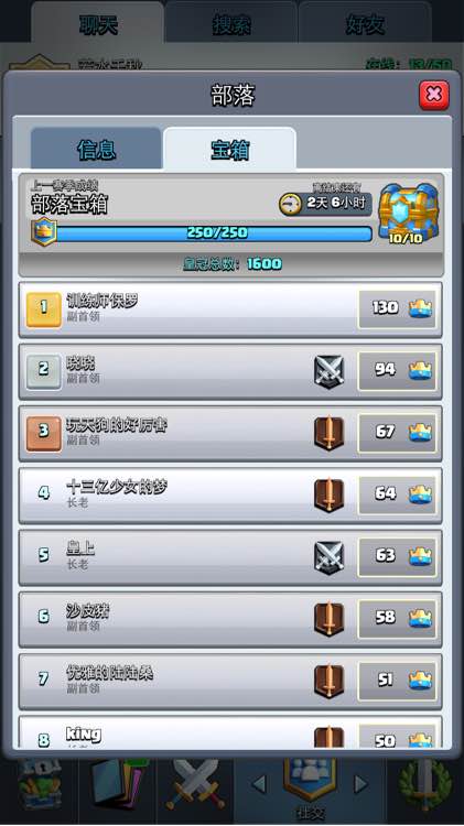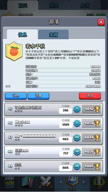 若水千秋,4.6杯,全员4000+,周捐4万,任何卡秒满,皇冠宝箱一天打满,内有6个最高5000+的大佬,招历史最高4600的活跃玩家,加部落请先加微信614697632,拉进部落群方便交流联系,有位置可以直接申请部落,24h在线等