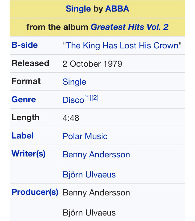 百科上查了下说是收录在1992年9月21日的《Gold:Greatest Hits》中的,但是ABBA乐队1982就解散了,这应该只是精选集吧。也有人说78,79年就有这首歌了,但不知道是哪张专辑有收录过。初来贵吧,求指教!