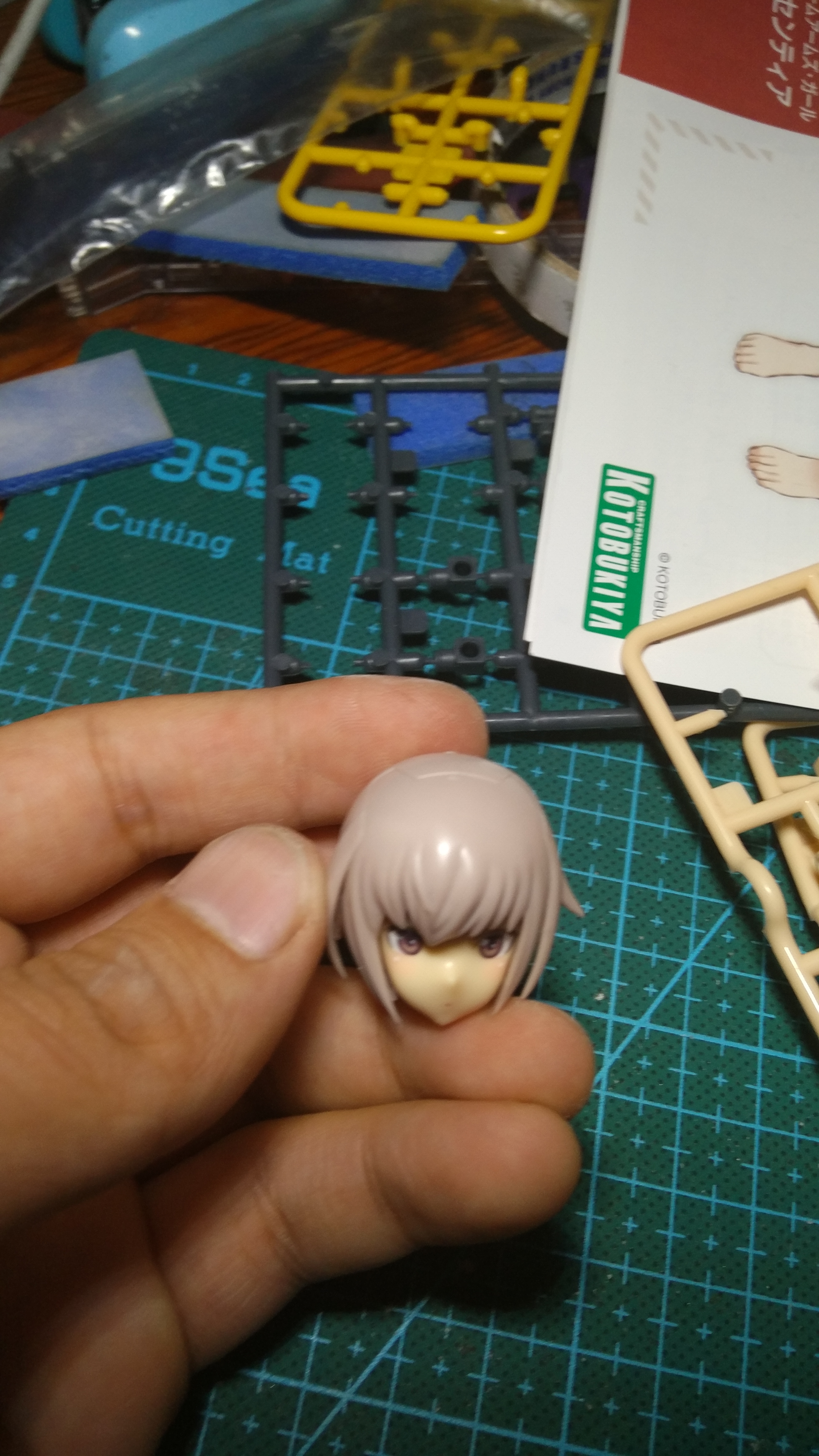 头部替换分2部分,前发可以选择有无猫耳,后发可以选择有无双马尾,都可以随意组合,只能组出一个完整头部(特典版勉强可以组2个头部,缺一个链接脸部的下巴,也就是可以拆别的机娘的下巴装进去达到换发型目的,因为特典版就是多一块金色的A板件)