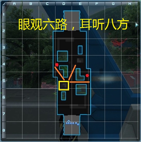 红点是在特殊情况偷袭的位置,步枪不推荐走后路。黄框是活动的范围,在黄框右上角的位置我们可以观察到任何一条路(橙线)的动向,尤其是左路,可以说完全被有心观察的步枪封死。右路虽然能看到,但有台子挡着,你无法阻止对方大剑杀在右路台子附近的队友。而用视线封住了右路就等于封住了后路,大剑大多情况下只会走右路绕后,接下来进入视频中森林过后防后路偷袭部分的解说。
