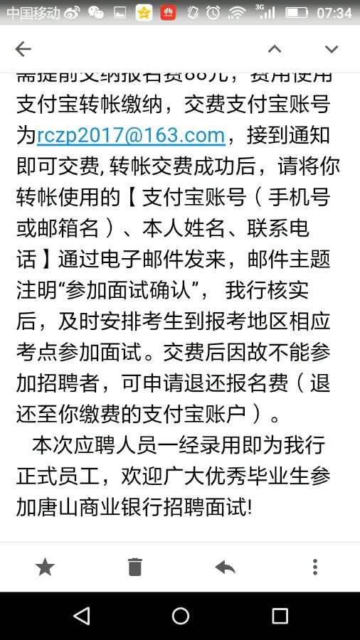 他们参加面试之前还要钱吗?我感觉是骗人的。因为之前参加四大的面试没要钱。所以我觉得给我发的那个邮件可能是骗人的。没有写唐山银行的全程(唐山市商业银行股份有限公司)之前四大都很正式写全称。所以我来问下大家,如果以后有以免被骗