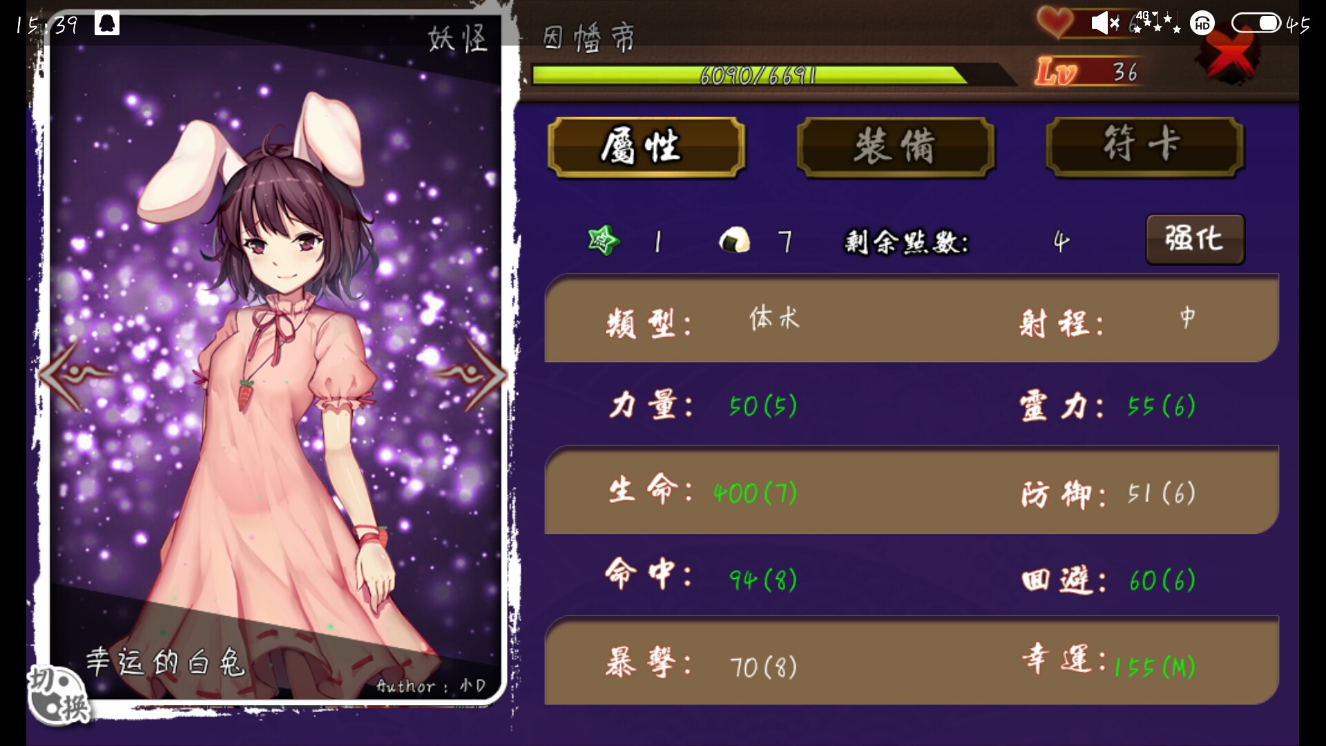 进去嗑个药,随意了,玄学,兔子我的才41级,水手服加生态炸弹(这个初级装备加25点的幸运),通常幸运上170以上兔子本身开符被爆的几率会比较小,然后纸这个阵容必须是每局转转和兔子两人必须有一个开符,如果两人都不开符且美玲还3连暴,你就准备收尸吧