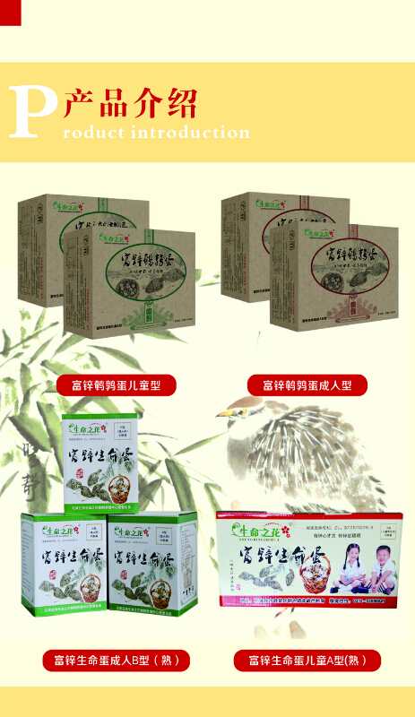 鹌鹑是优质禽类,鹌鹑蛋的营养价值比其他的禽蛋类都高。鹌鹑蛋被认为是“动物中的人参”。而且其组织细腻,其营养物质更有利于人体吸收。石家庄生命之花鹌鹑养殖中心研发的富锌鹌鹑蛋,就是利用鹌鹑这个高级的“加工厂”来加工优质的富锌蛋。本中心精选8种优质中药材(牡蛎、黄芪、山萸肉、菟丝子、决明子、柏子仁、熟地、天门冬)经过科学配伍以后,按照严格的比例添加到鹌鹑的饲料日粮中。通过鹌鹑自身的高强代谢、吸收功能。使日粮与中药材中的营养物质,药用成分一并吸收分解在鹌鹑蛋中。尤其是鹌鹑蛋中锌含量有了数倍的提高。因此被称为“富锌鹌鹑蛋”。这样就为广大的妇女,儿童,中老年人等等缺锌人群提供了一个科学的补锌方法。同时它还具有很好的食疗,食补作用。是很好的食疗滋补食品。该产品于2013年获得国家发明专利。