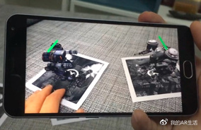 其实最简单的 AR 效果,用我们口袋中的手机(或者是带 RGB 摄像头的 PC)就可以实现。下图是智能手机上的一个 AR 游戏,通过摄像头识别对应卡片,就可以在画面中看到卡片上站立了两个机器人。原理是基于 Marker 的识别与跟踪,或者也可以通过 SLAM 技术实现。