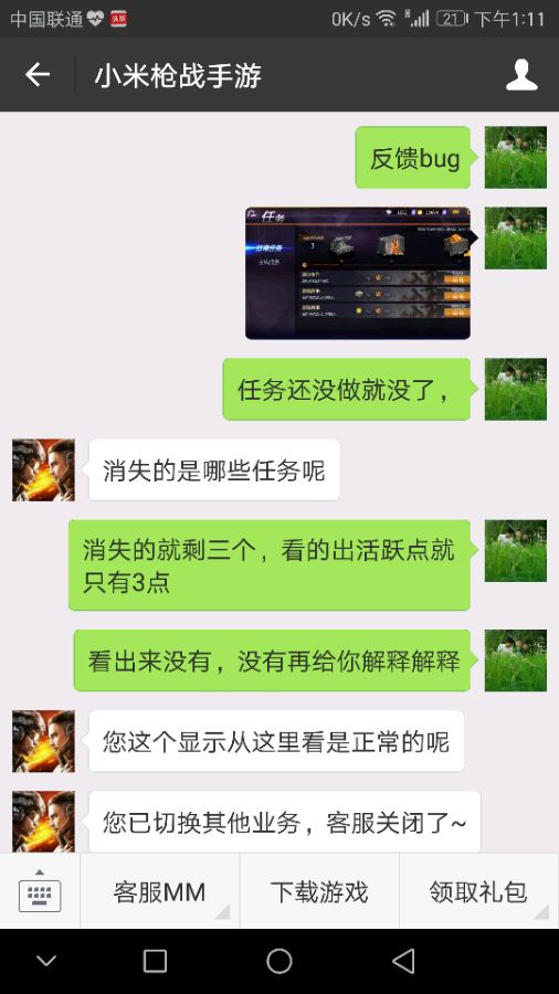 今天的没日任务消失的剩三个,重那看出来消失的呢,一,我还没做任务,二看活跃点如果任务我做了活跃点肯定不止这些,活跃宝箱肯定都得到了。反馈给微信小米枪战客服,他说没问题。