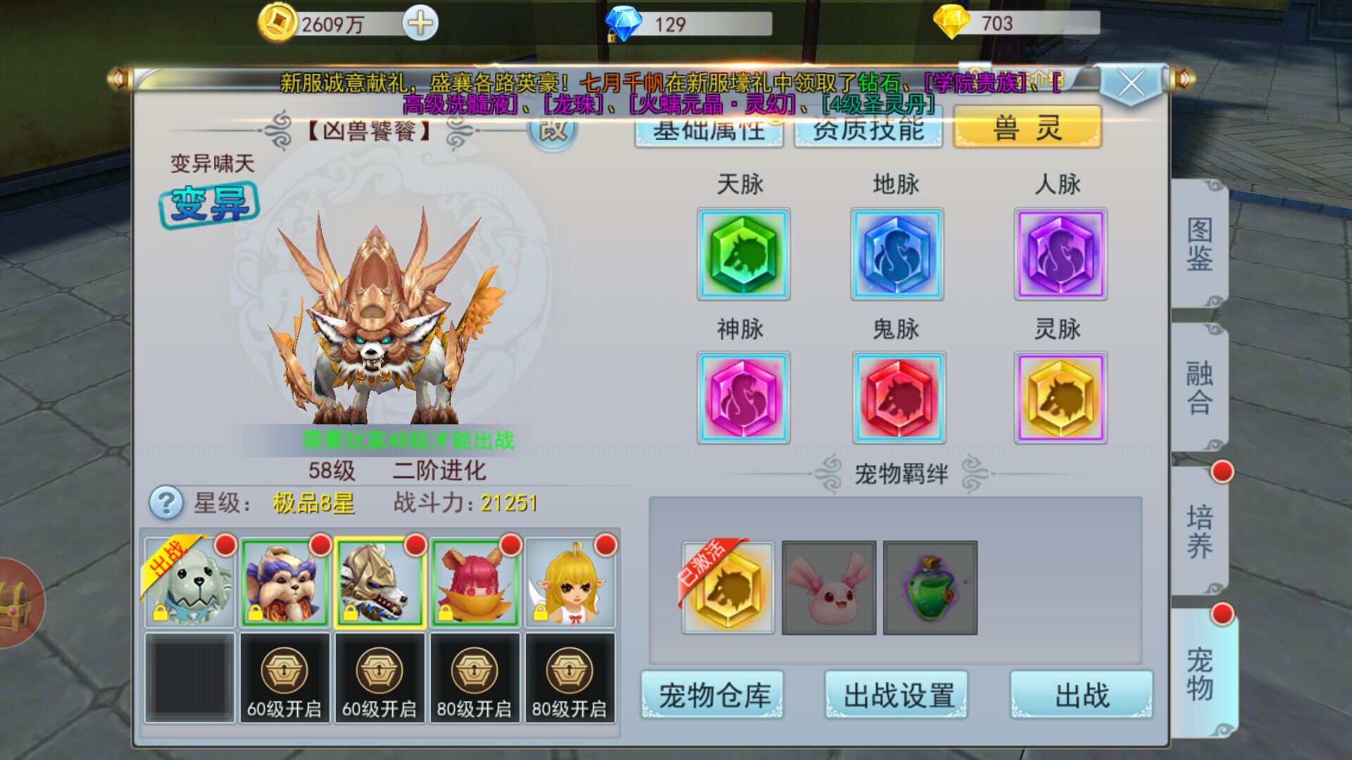5、宠物的兽灵如图,每个宠物可以佩戴8个元晶,相当于宠物装备把,下面还有一个宠物羁绊,激活达到条件的话也会提升宠物不少的战力,有多余的变异宠物就别着急回收了把。