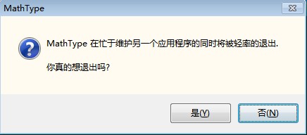 但是昨天20170412用快捷键Alt+F4关闭mathtype时会出现下面的弹窗,提示“MathType在忙于维护另一个应用程序的同时将被轻率的退出,你真的想退出吗?”。选择“是”,托盘区的mathtype服务器就会退出,选择“否”,托盘区mathtype服务器不会退出,两种选项都可以关闭窗口,但是选择任何选项后重新编辑公式再用快捷键Alt+F4关闭mathtype时下面的对话框都会复现,请问有人知道如何设置才能避免再次弹出这个对话框吗?