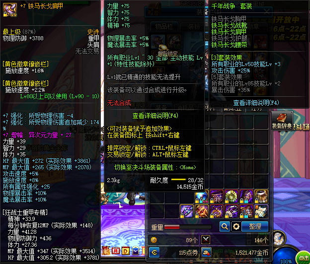 又刷了几千票出了些没用的,铁马三红五以上肩膀宝珠,11的英雄王,有稀有绝版符咒(红眼神器),伤害比一般的85套要高点,你可以继续追求铁马套,不用换装备,现在伤害也很高