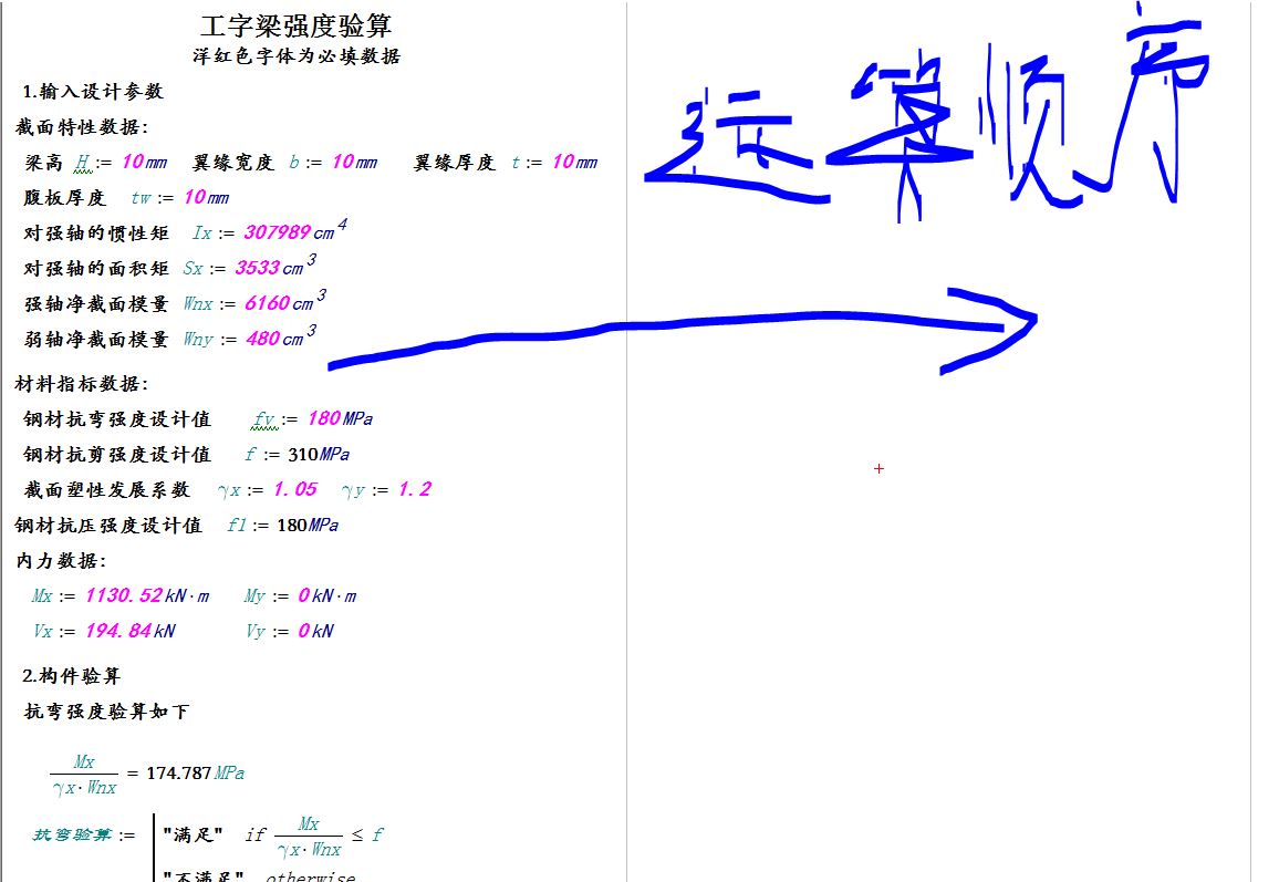 刚刚学习MATHcad,想学好他,下面是我自己写的一个计算书(超级菜鸟级),请大神们(特别是钢结构方面)指导下看看这计算书哪里有错还有这个哪里需要优化的,还有下面两个问题希望能有好心人指点一二。