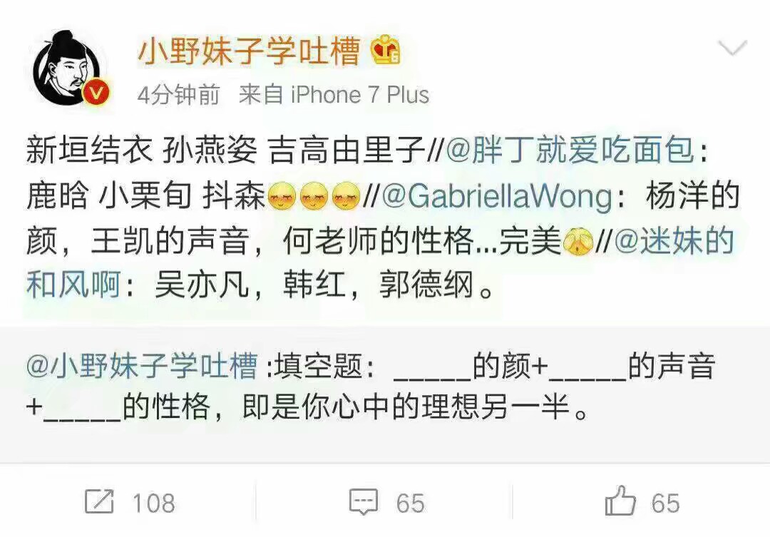 理想中的另一半=( )的颜+( )的声音+( )的性格