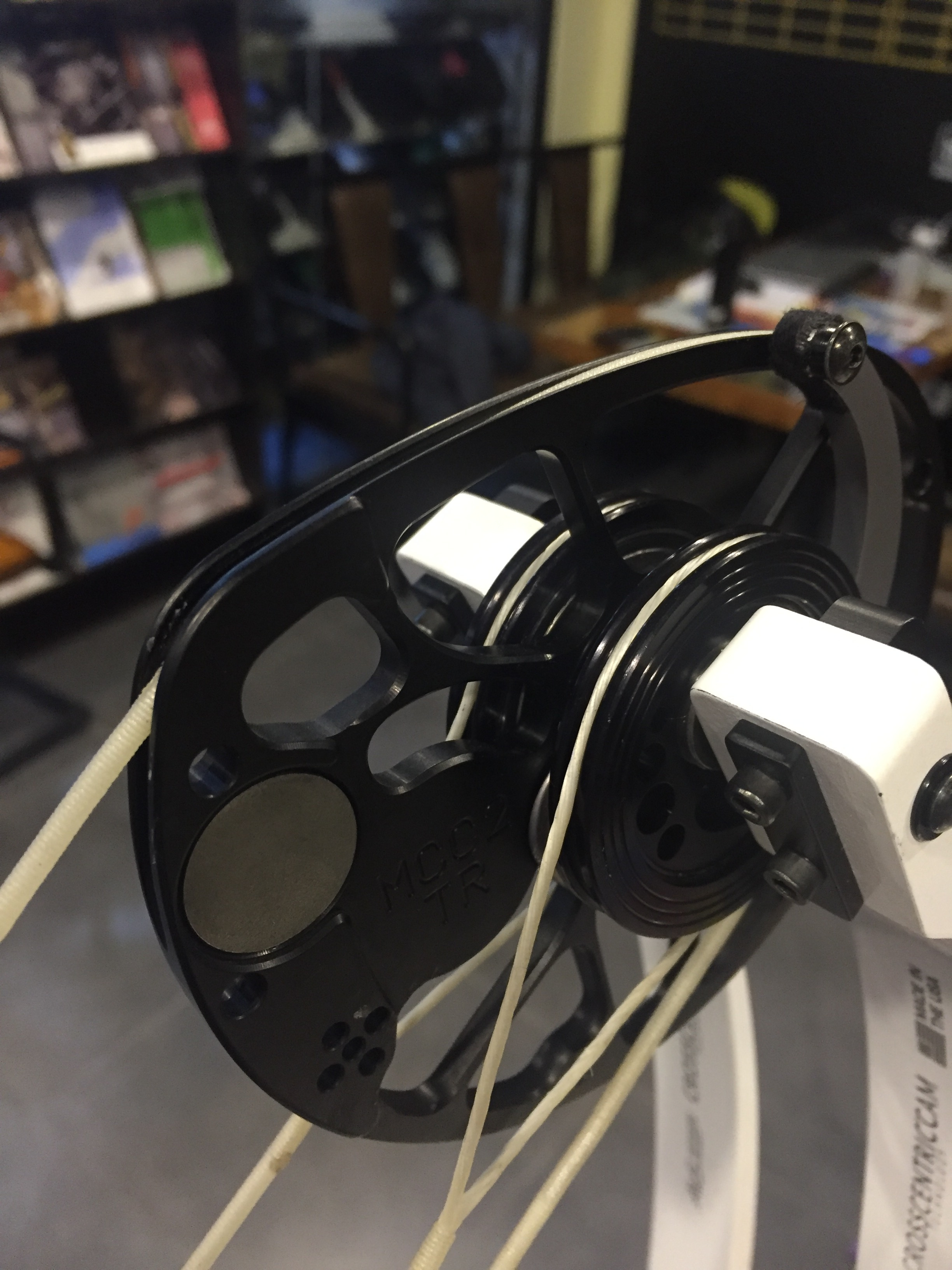 弓的拉锯因为轮组的结构限制,只有26-31调节。 省力比调节非常有意思,它是独立在拉锯模块外,同时也是弓上下停止点的下图中黑色部件,这个部件靠里面是90%省力比,如果像图中这样支出一截,就是80%省力比,这种调节模式优势是非常方便和简单,但是也为拉锯带了问题,我后面会总结。