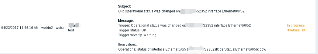 最近在捣鼓zabbix用来监控公司交换机,做到微信报警时遇到问题了,没能发出消息。查看动作日志显示状态是橙色“启用中”。测试过脚本没有问题,可以发出消息。