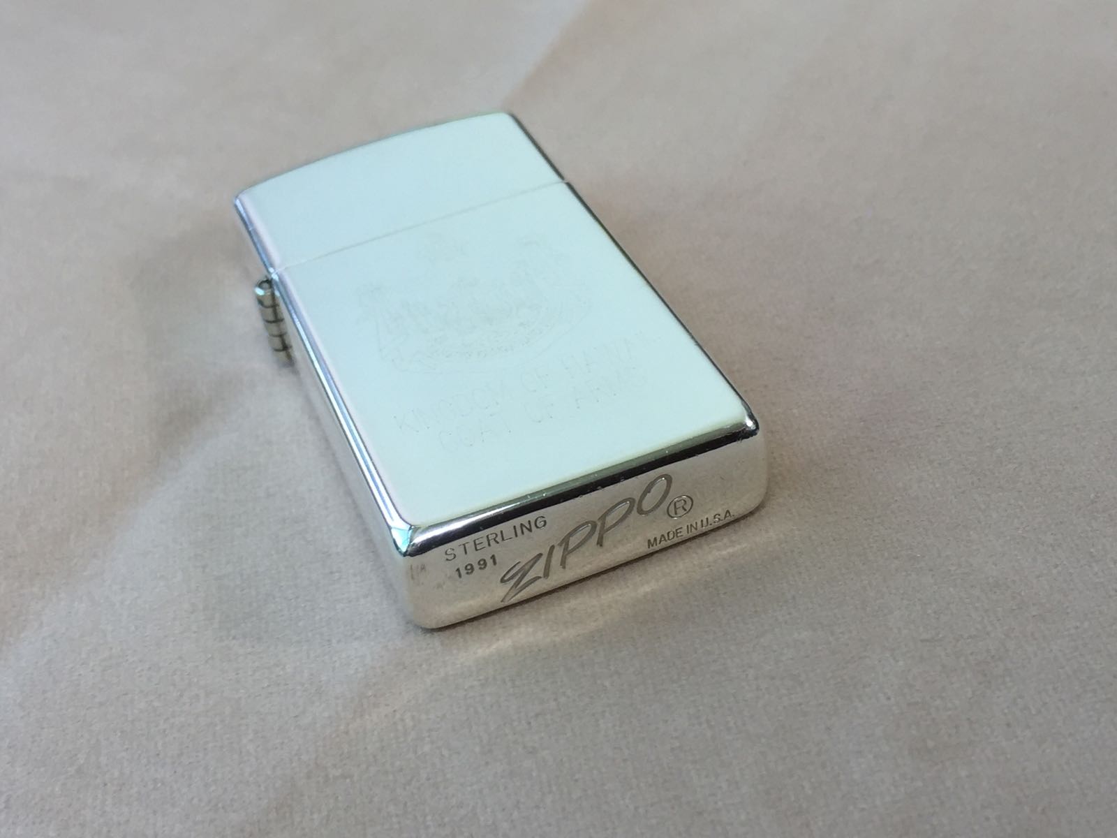 【具体描述】二手1991年斜底纯银窄机,浅雕夏威夷皇室徽章。机身正常使用擦丝浅划痕,无修复,八角无磕碰。顶部边缘少许极小针眼,底部一侧浅刮痕,均微距拍出,总体品相不错。铰链正常,原配91L内胆打火强,后配黑绒盒包装。