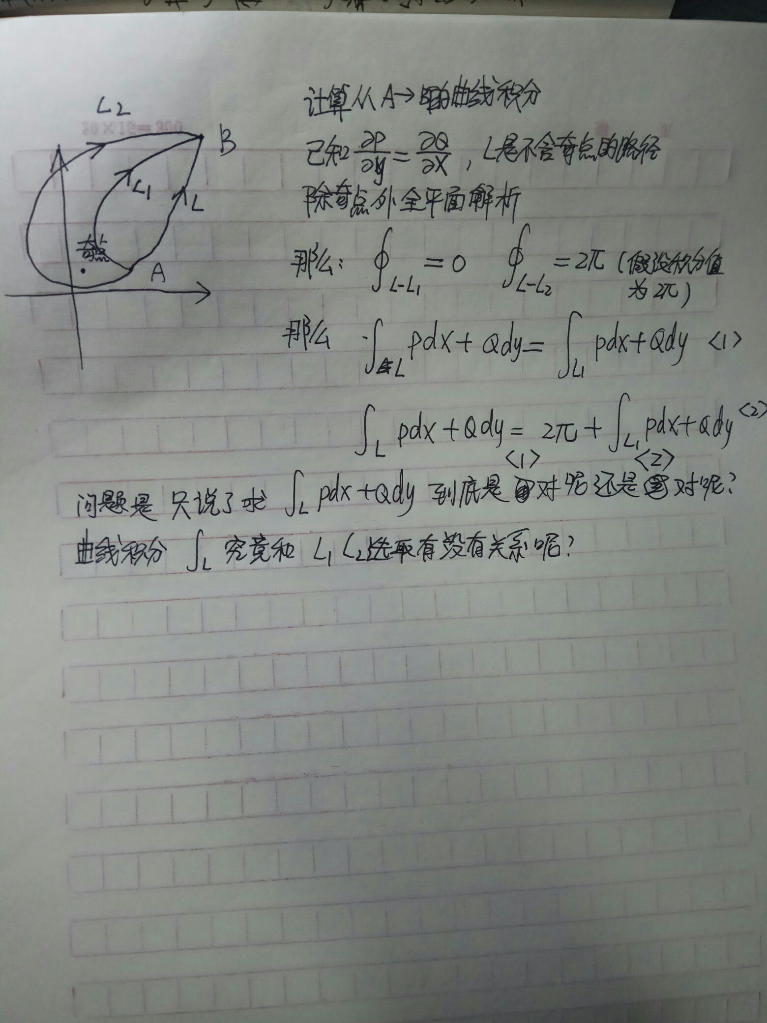 但是如果有奇点呢 是和不含奇点的积分差2pi呢还是根本就和路径有关呢 不明白啊