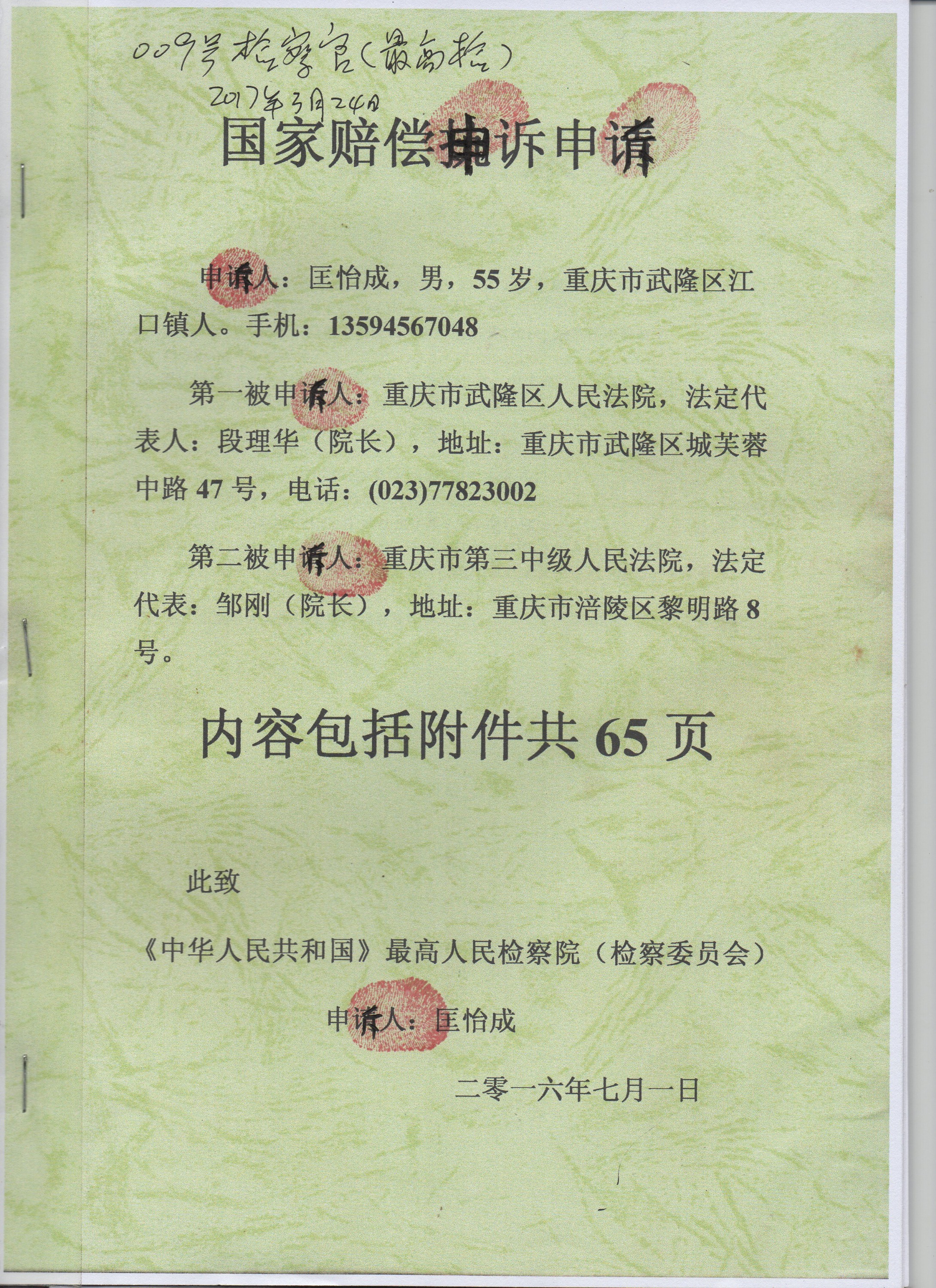本案理应由重庆市高级人民法院直接依法作出国家赔偿决定的,为什么还要推给违法的一审法院和有错误的二审法院去作出赔偿决定呢?这不符合常理?也不符合法律程序?这是法院在继续“任性” !这是法院在继续捍卫和保护自身的违法行为!此案必须应该有第三方来监督再审!那就是最高人民检察院来履行您们的神圣职责:履行您们的司法监督职责!