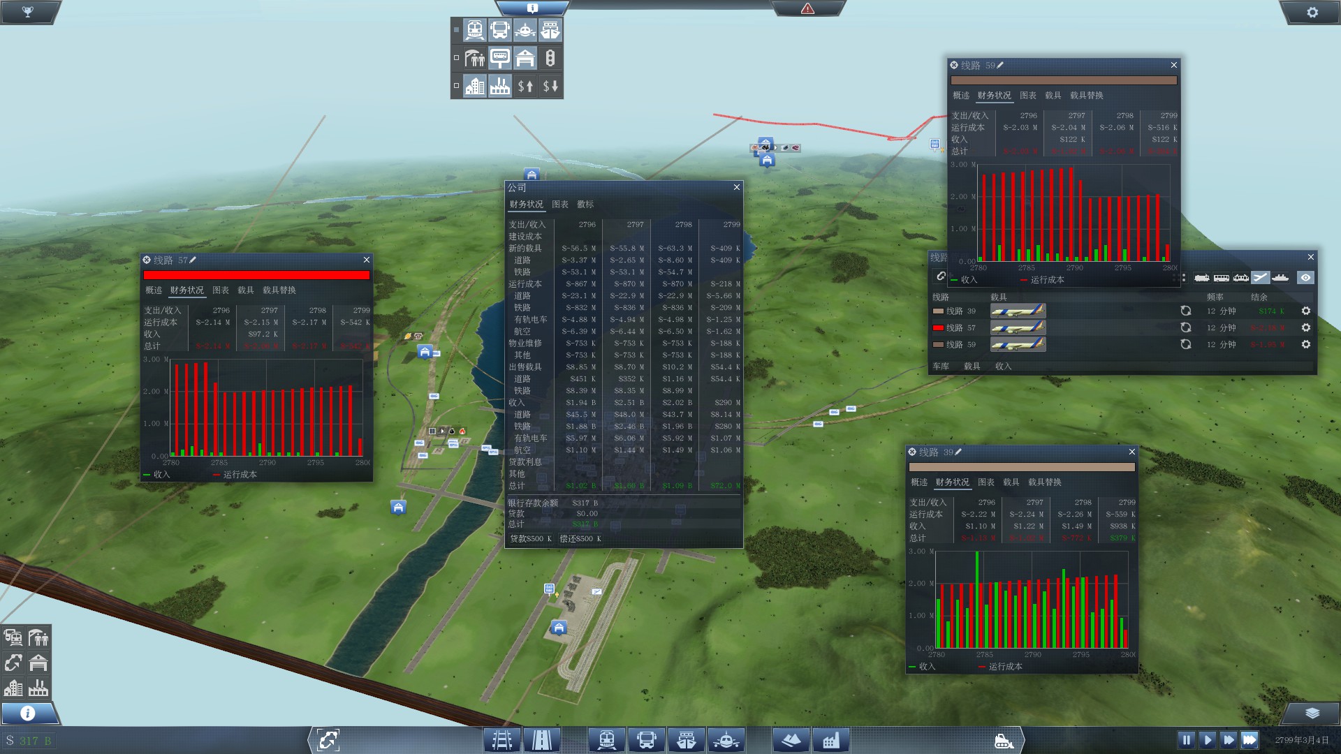总共四个城市建了三条航线 坑爹的是没有一条是挣钱的,头疼