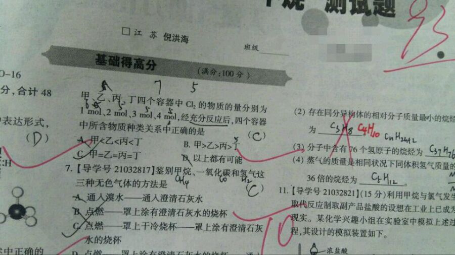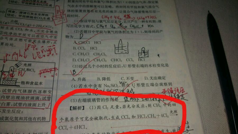 基础得高分的第6题。1mol甲烷和4mol氯气不是完全反应生成四氯甲烷么?为什么这几种情况下的生成物中物质种类会相等?