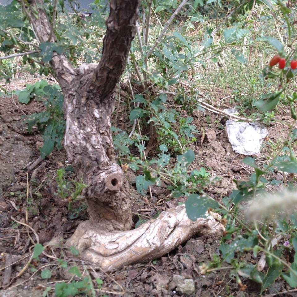 这棵枸杞上面全被截了,我挖了下,根部有15公分粗,只好放弃了,回家拿锯截下了这段祼在外面的根。