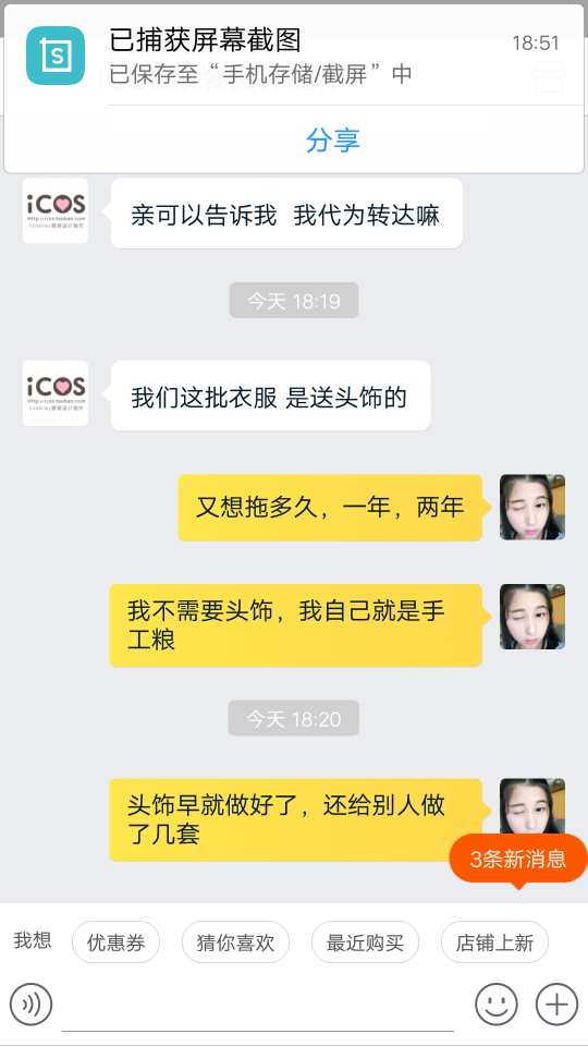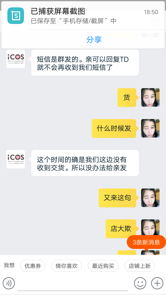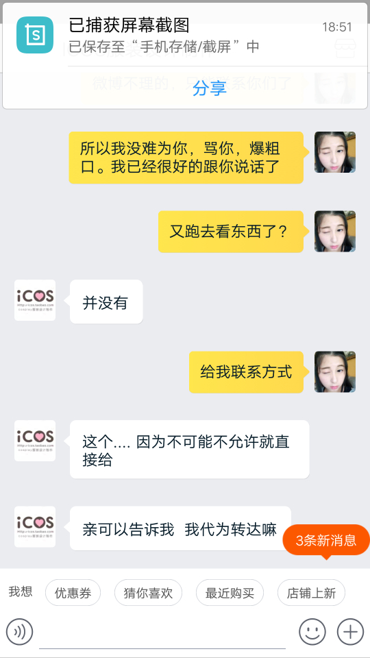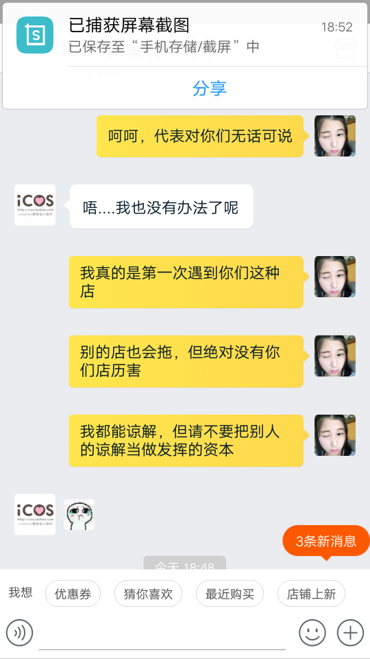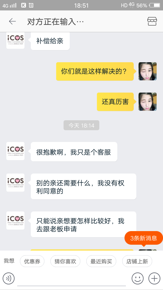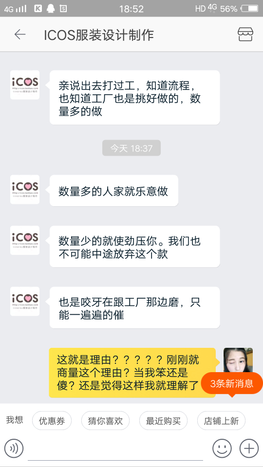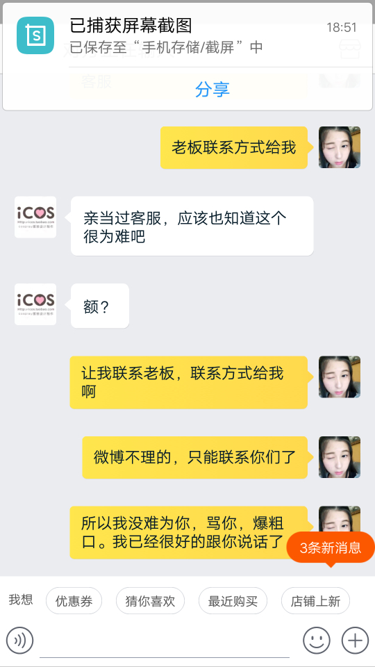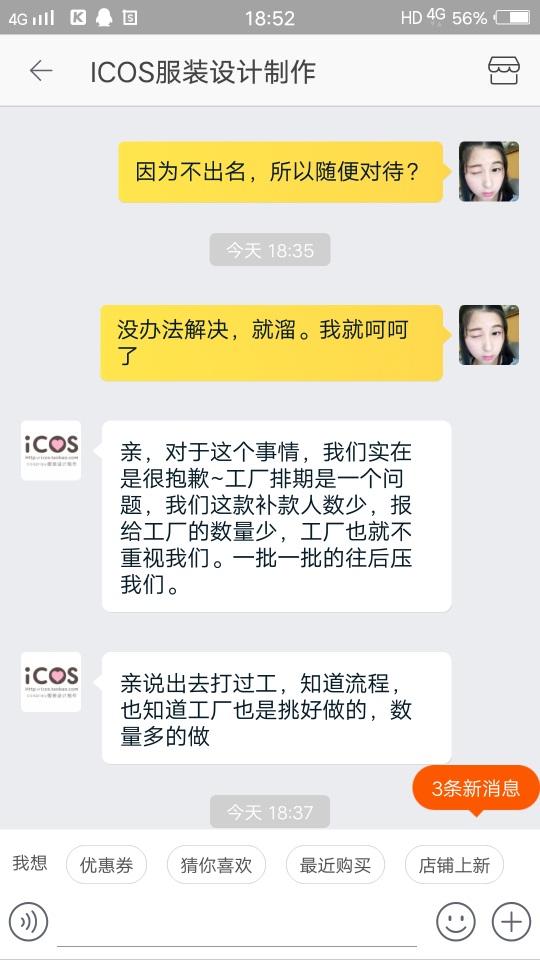 因为喜欢cosplay,自己再圈子里只是一个小透明。挂icos家是因为他们家实在太过分了,我10月参加的征集,一月16付完的尾款,之前他们家说付完尾款后一个半月就会出货。之后拖了,我就去质问,他们家告诉我四月会发货。我相信他们所以等待。可没过多久他们家把付完尾款一个半月的消息给删了,删了,删了。我相信他们家所以没有去截图,因此也没有证据指责他们家。我认倒霉。后来我又去问他们什么时候发货,他们家就一直拖,能拖多久就多久。客服小姐姐让我跟老板商量怎么解决,我也做过客服,以不想问难客服小姐姐,我就让小姐姐把老板的联系方式给我,也许小姐姐觉得我会过去爆粗口,所以委婉告诉我不能给我。那你她妈还让我联系你们老板干嘛。怎么认识大佬就可以随便欺负客人吗?跟客服小姐姐理论,(我期间很想爆粗口,但是觉得客服小姐姐工作也不容易,所以一直忍耐。也许其中语气会有些重,所以先再这跟客服小姐姐道个歉,对不起)我也不是很不讲道理的人,之前也会有些店会拖,我也知道工厂做单的程序,所以我都会理解。毕竟大家出来打工赚钱都要相互理解。可是icos家太过分了,一直给我拖,你去质问就给你打哈哈,若是遇到不像我这种暴脾气的妹纸,他们就一直给你打哈哈。后来在闲鱼上遇到和我遭遇一样的妹纸,结果他们家也跟这个妹纸打哈哈,难道我们是小透明就可以随意欺负?后来再交流中客服小姐姐说可以退全款给我。你妈当我这几个月白等?让我去领他们家优惠卷或者他们家以最低价卖我另一套衣服。我现在根本就不想看见他们家的衣服。聊到后面,客服小姐姐就告诉我她下班时间到了,要走了?????一言不合就下线?你也是棒棒的。后来在朋友的建议下,我去微博找到他们家老板,老板先跟我说抱歉,告诉我他们也不想这样。让我在他们家可以随意拿走阴阳师系列两套衣服,总价要低于700。难道拖欠就可以随便扔两套衣服给我,就当解决了?这个解决方案也是历害。我其实很想说你们家衣服是因为卖不出去了吧。所以这些衣服都比之前征集的还便宜。过了一天我觉得有可能是我语气不好,也许商家也没办法所以才这样解决。就打算私下解决就算了。结果你猜怎么着。联系老板,老板一天没回我。我就想有可能忙,所以我就再等等。结果到现在都没理我。你也是厉害了,大佬。做人都是有底线的,你们家已经踩到我底线了。对不起决定挂你了。我已经妥协了,可是你们不愿意我也没办法。