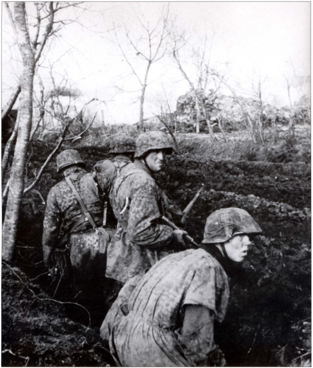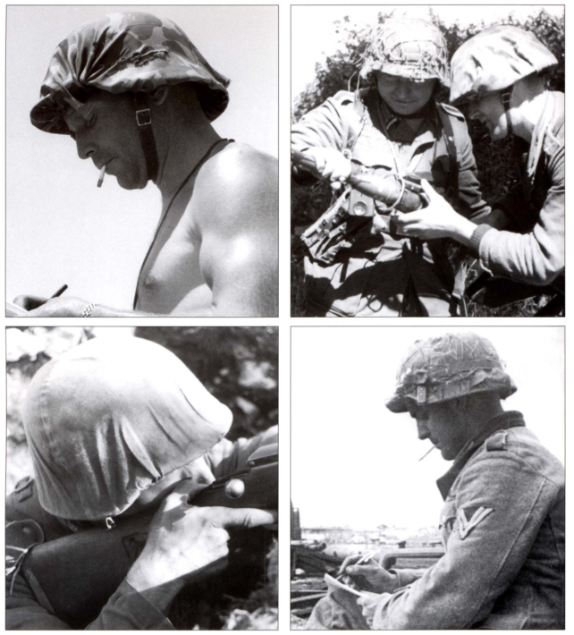 上图:一块粗糙的麻布用一条铁丝固定在M42钢盔上,旁边的军官挂着一个毛瑟望远镜,胸口别着一个铁十字勋章和一枚似乎是黑战伤的勋章。还有一个勋略下图:一块自制的伪装布,用一根布条固定住。