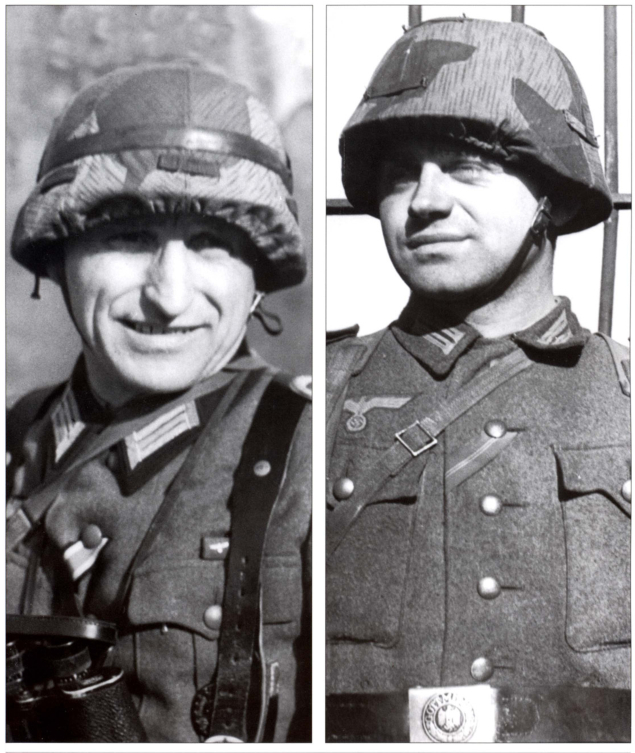 上图:一块粗糙的麻布用一条铁丝固定在M42钢盔上,旁边的军官挂着一个毛瑟望远镜,胸口别着一个铁十字勋章和一枚似乎是黑战伤的勋章。还有一个勋略