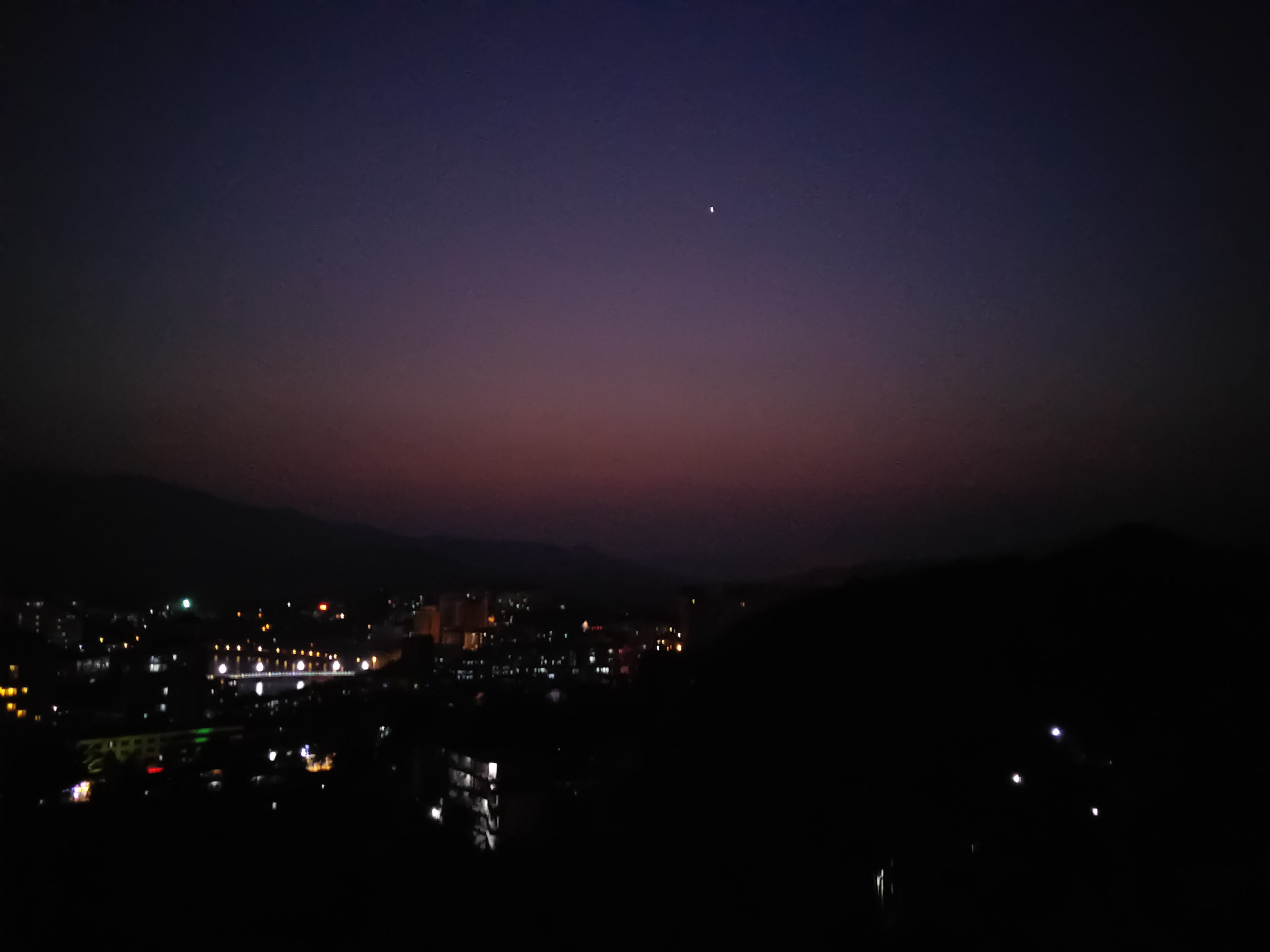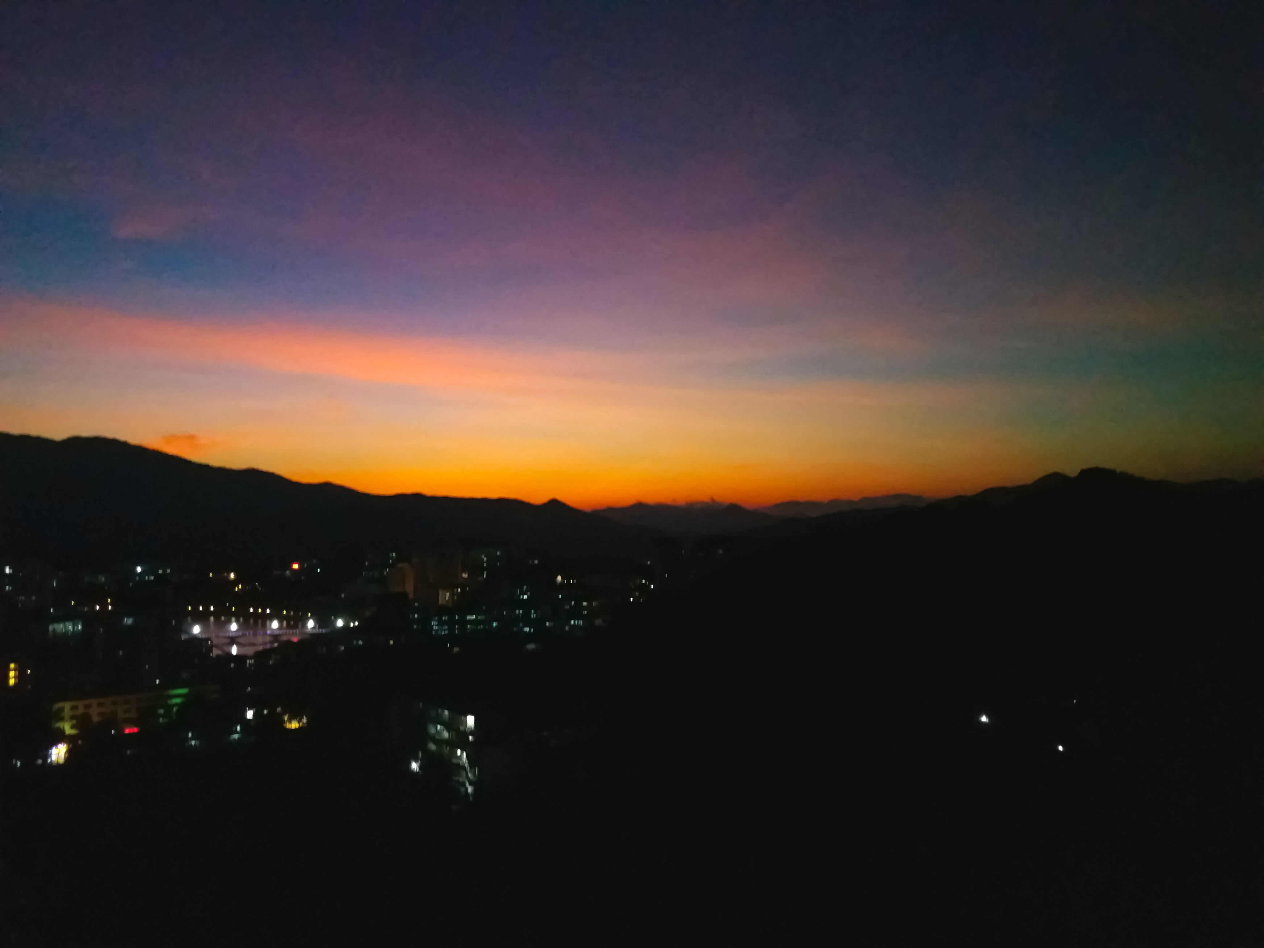 再然后给你们放上几张夜景图,这些不是在同一天照的,说明一下,完全无滤镜!完全没有!这里的天在傍晚的时候超级好看,像假的一样好看,这是在宿舍窗前照的,如果你们住在民宾,福利真的甚多,每天傍晚都可以看到极美的夕阳,夜景也是很美,而且,俯视五指山市。