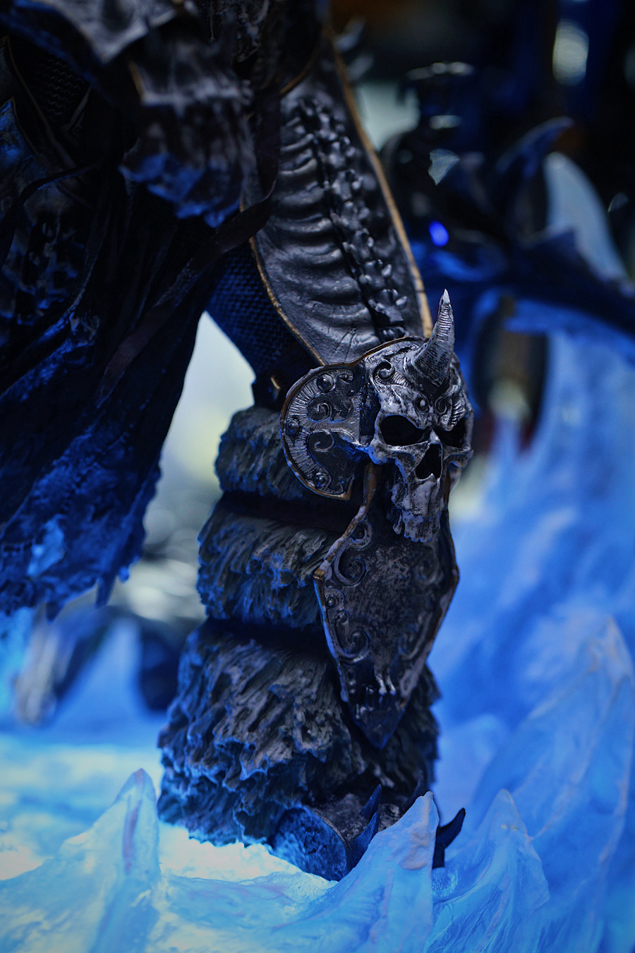 最后说说我这款植发重涂后相比SS原版改进的一点地方:身体部分、霜之哀伤以及地台全部追加冰霜效果,头发改成白色植发,地台改造加灯发光并且重涂增加蓝色使其更接近CG中蓝色冰块效果,电源改成外接电源供电和电池供电双模式。。。个人认为重涂修改后的阿尔萨斯应该说是目前最完美的阿尔萨斯了,话不多说,上图分享