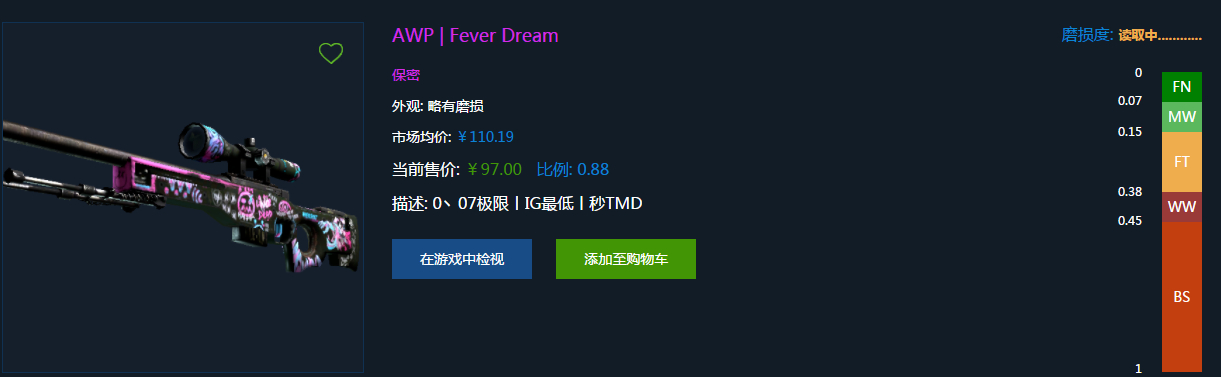 新AWP要搜Fever才搜得到,0.07磨损直接按高磨损的底价走了,盘97.