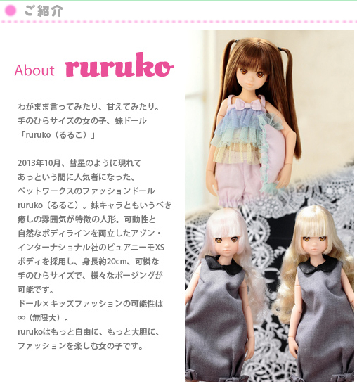 ruruko是由日本厂商petworks设计生产销售的1/6可动人偶。petworks的自我简介是:“ペットワークスは、小さなソフトウェアと小さな人形と小さな飛行機を作っている、小さな会社です。”,翻译过来就是说petworks是一个制造小型软件,小尺寸人偶和小型飞机的小型公司。