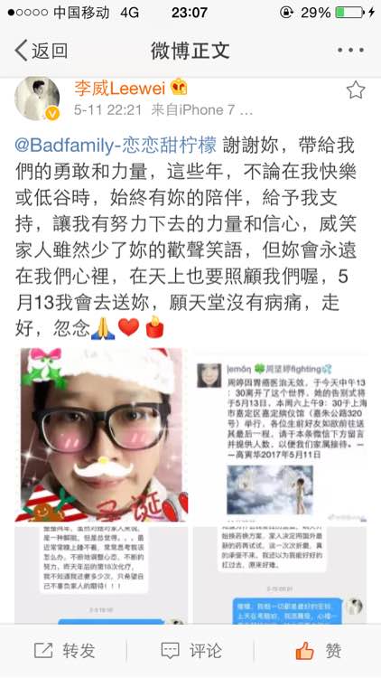 虽然你走得很突然,我们一时间没办法接受,但如果你走了,不要再受病魔的折磨,我也愿意接受这个事实,不管你在哪里,你永远都是我们善良坚强的小柠檬,威威13号会去送你最后一程,你就安息吧,在天堂做个快乐的天使,很多年后,我们在天堂再聚,我爱你!柠檬,一路走好。