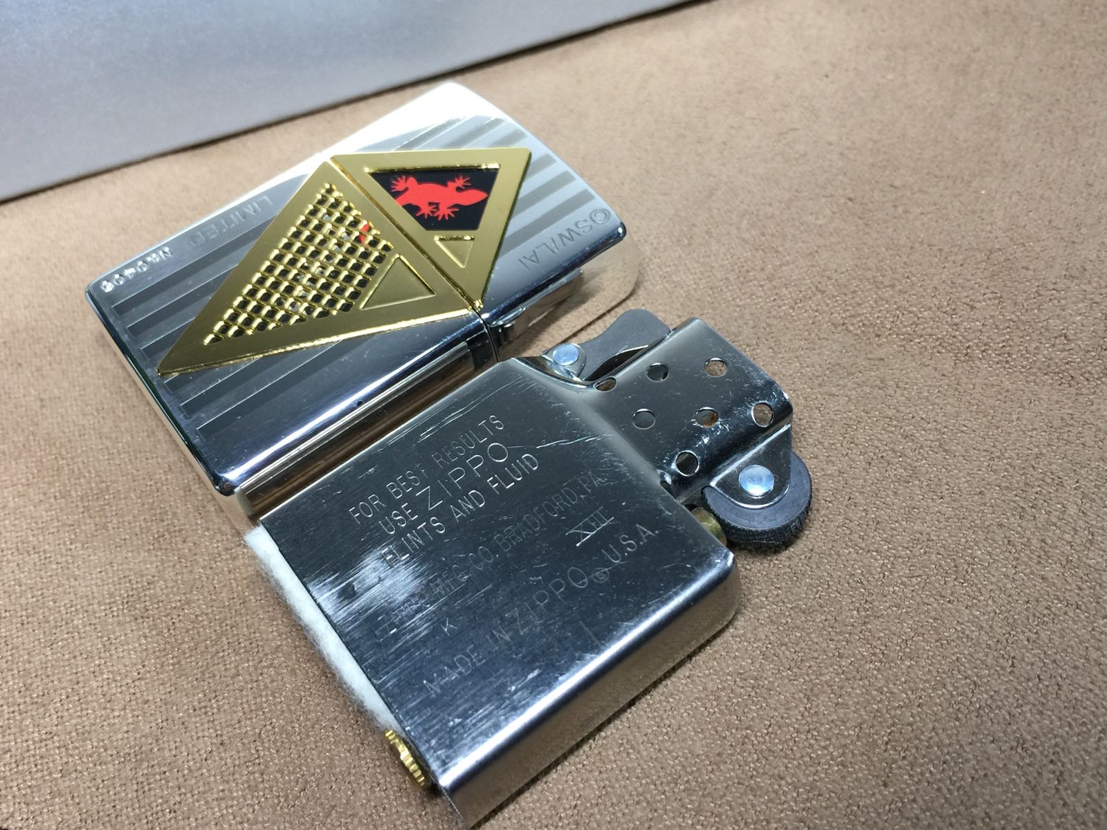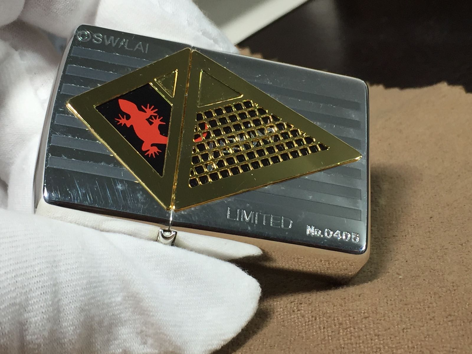 【具体描述】全新1997年7月 潮牌LARKINS 限量镀银小壁虎套装,本套编号0405,壁虎谐音庇护,自用送人都不错。本机为镀银底板 蚀刻填漆+精美镀金贴章工艺。机身局部存储擦丝强光拍出,正常角度不明显,铰链附近有些氧化痕迹,定义全新一般品。原配全新97K内胆,全套盒说齐全。