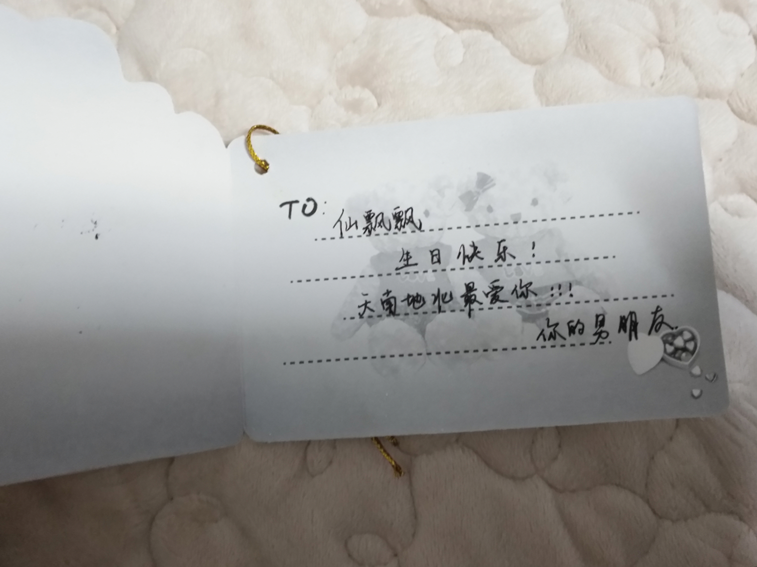 给我的备注是仙飘飘,每个情人节、七夕都给我礼物,留言落款写的是男朋友
