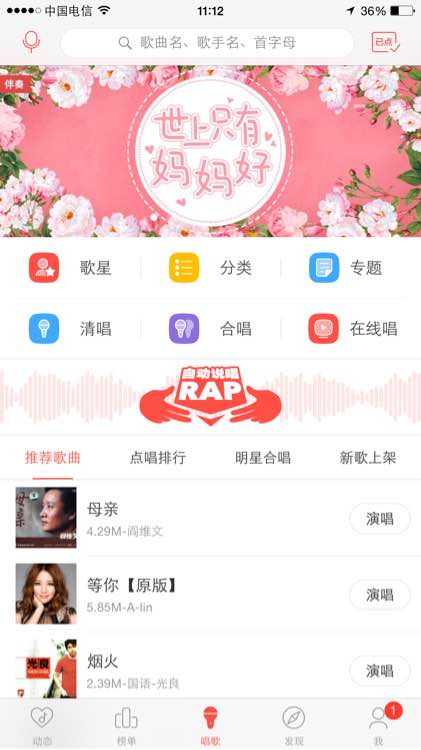 唱歌(话筒)这个页面右上角有一个已点,里面是你的已点曲目,最上面有导入本地伴奏(没有的话往下拉一拉,把隐藏的拉出来),点开把手机里的伴奏倒入即可。