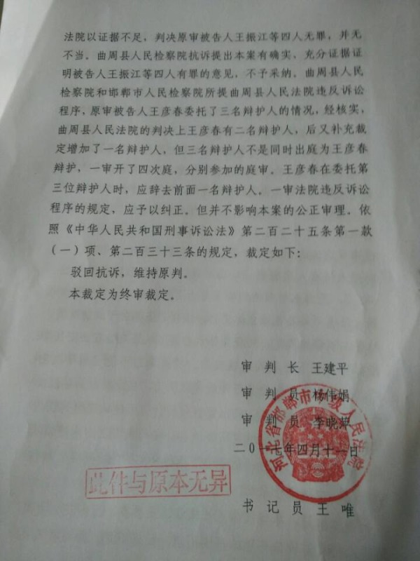 2017年4月11日,邯郸市中级人民法院作出终审无罪裁定,王振江等人也终于长长的舒了一口气。在长达5年时间里,这场官司历经十几次开庭六次审判,两次发还重审,八次补充侦查,马拉松式审判终于结束了。