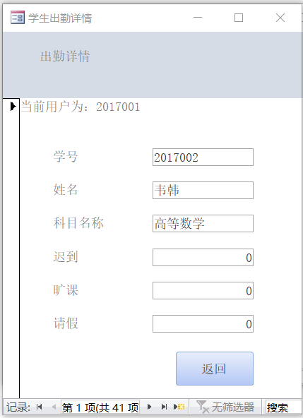 当前用户ID作为公共变量,以此ID为关键字段获取当前用户记录,如果当前ID对应用户是学生的话,用VBA将学生出勤详情窗体的Recordsource设置为ID为当前用户学生号的那一条记录。也可以将该条记录通过recordset对象写入窗体的对应文本框,窗体控件的enable属性通过代码设置为False,
