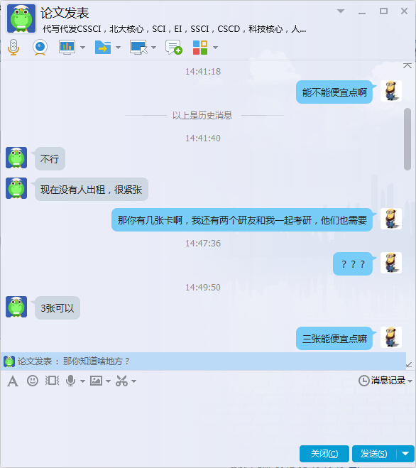 我就直接还了一个价。。。满满的套路啊,为了试探他是真诚想出租饭卡,还是中介或骗子,我就套路他,说自己还有研友,当他说出3张可以的时候,我决定继续调戏和套路他。。。看看他的狐狸尾巴