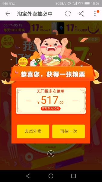 我抽到三张517,第一天打客服说是根本没有517这个奖项的,抽到的全部都给满50-10的,我都录音了,说是我理解错误了,是517这个活动没有517块钱这个券的,我眼睛是瞎了吗,明明白白的写了17张517,既然没有就算了。今天又说找了17个人发了517,给我发100张5.17的,简直了,还不如不给,更生气,让我一天三顿贴钱吃他们外卖吗☹️而且是不是该我我300张的