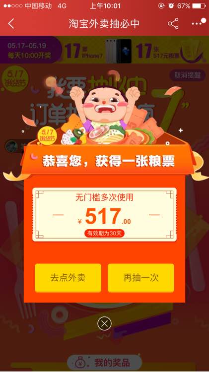 昨天淘宝外卖517饿货节抽奖抽中517元,一开始以为要等今天开奖才能看到这张粮票,结果早上打开还是没有,问客服,客服说就是50-10那张粮票,我说那张跟我中的哪像了,幸亏昨天中奖时我就截图了,截图一发给他,就不狡辩了,只会抱歉了,本来准备曝光到淘宝吧的,结果今天淘宝吧不让发帖了,我就呵呵了。骗子