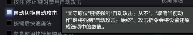 站在原地攻击就是:自动攻击-始终 然后按H啊 另外两个选项不要选