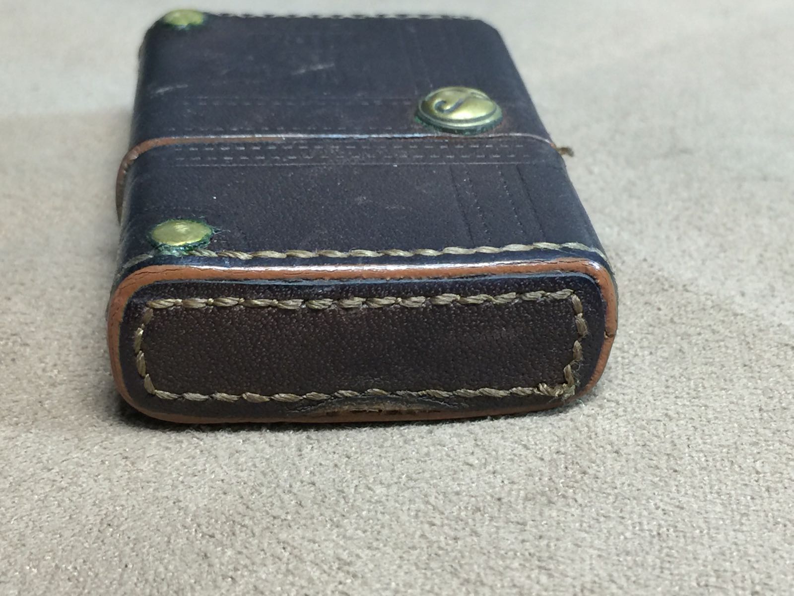 【具体描述】二手2001年左右 经典日漫 鲁邦三世定制皮机。手缝牛皮包底粘合工艺,表面烫印鲁邦三世LOGO和线条,正反面纯铜铆钉镶嵌,工艺复杂。机身正常使用痕迹,顶部有处皮面轻微翻起,合盖处轻微褶皱,铰链处有个线头 均微距拍出,定义一般品。铰链正常,原配01J内胆使用不多,打火强劲,无包装。