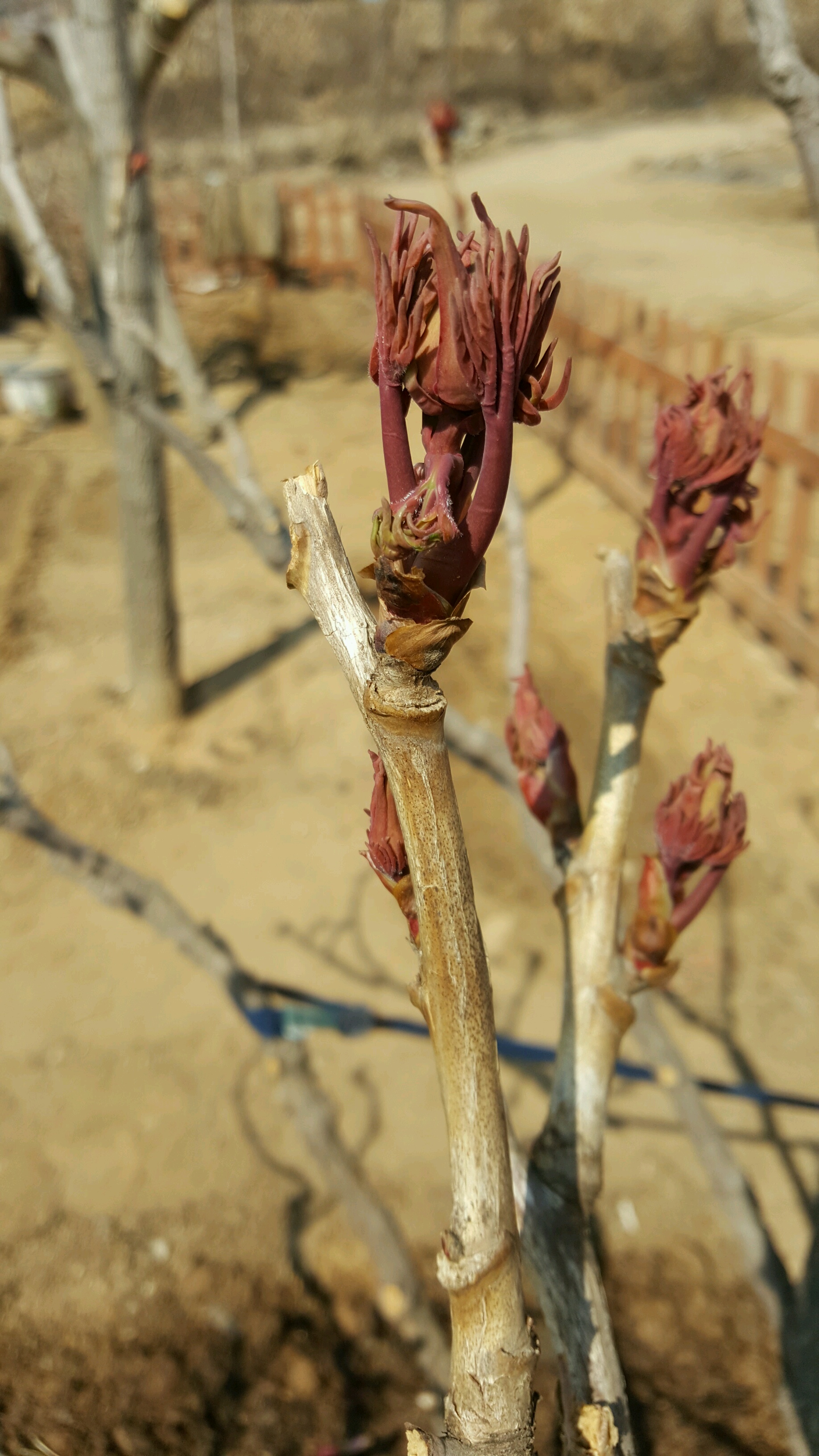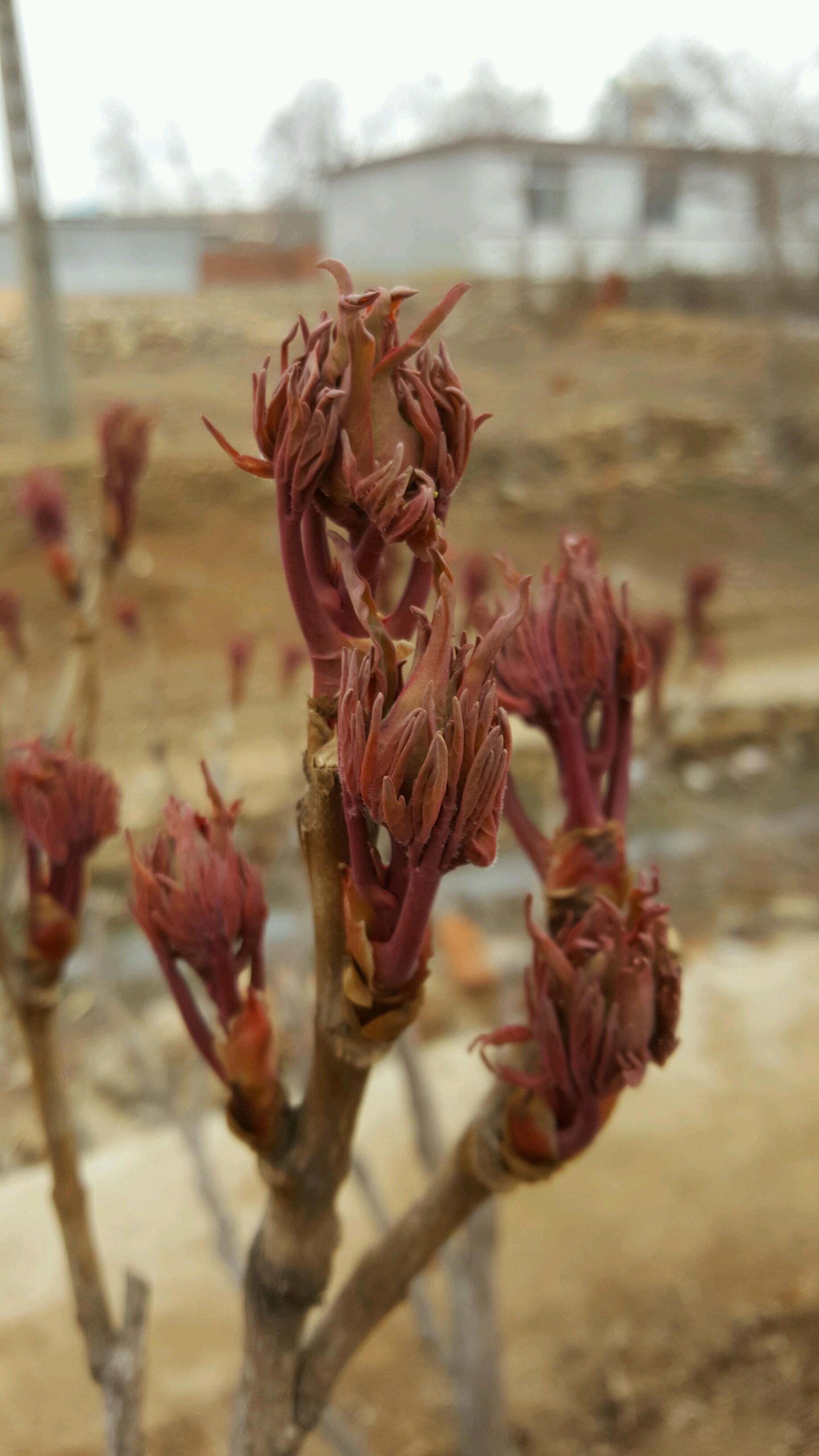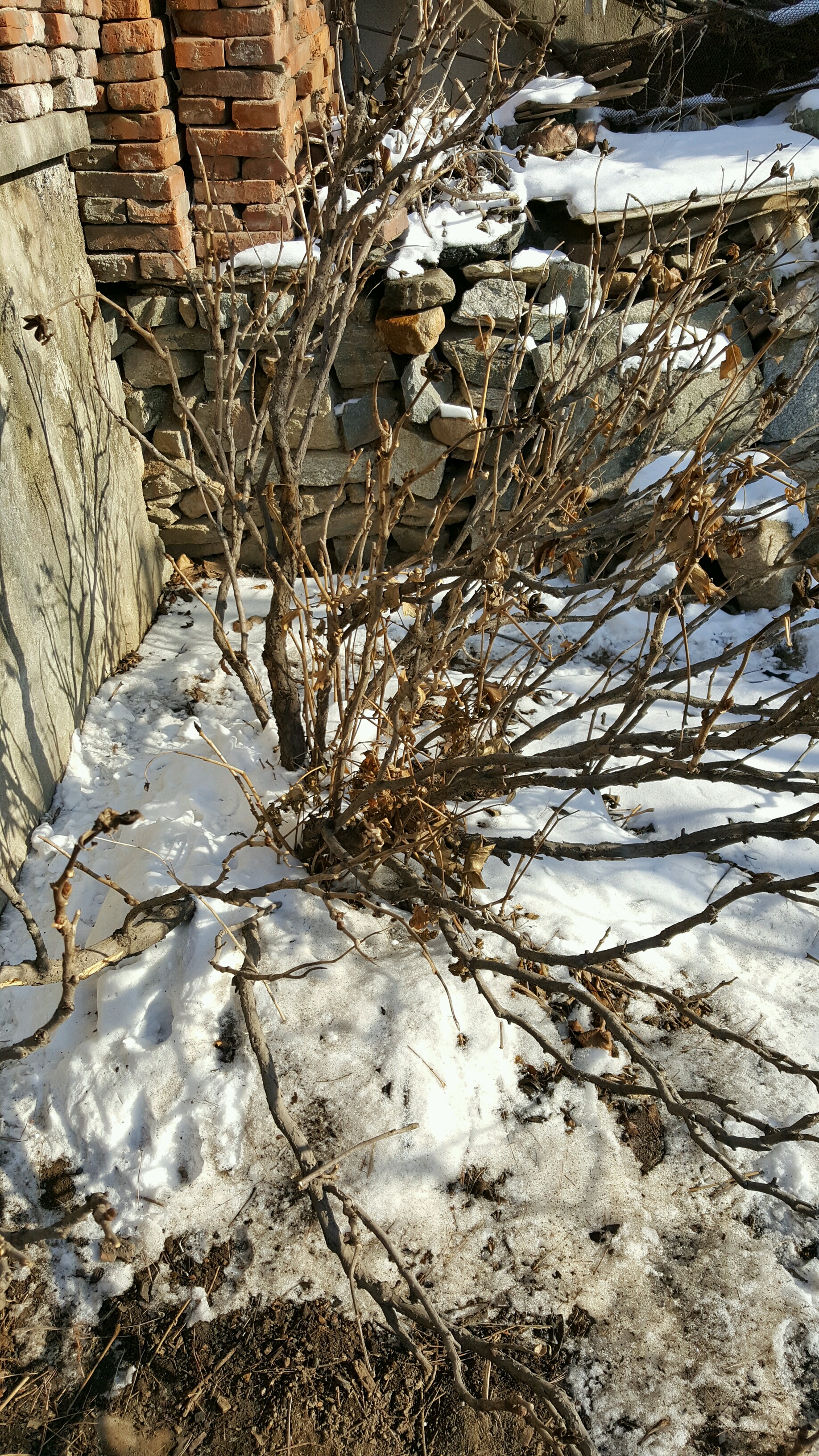 因本人在啤酒厂工作,所以每年快过年的时候我都会去几位要好的朋友家,给他们送几箱啤酒喝。这次也不例外,到了朋友家跟朋友闲聊时,朋友说在他村里有一户人家里有两个牡丹,都是养了几十年的,于是就决定去看看,第一眼看到这两株牡丹时,非常震撼,同时心里也为这两株牡丹觉得惋惜,这么多年主人家对她们根本就没有管理,长的歪歪扭扭,杂乱无章,毫无形状可言!