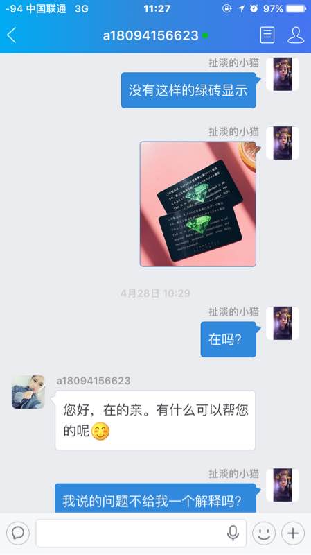 至此卖家再也没回复我。我就去去问了天猫西选的客服,就绿钻这个问题做个合理解释