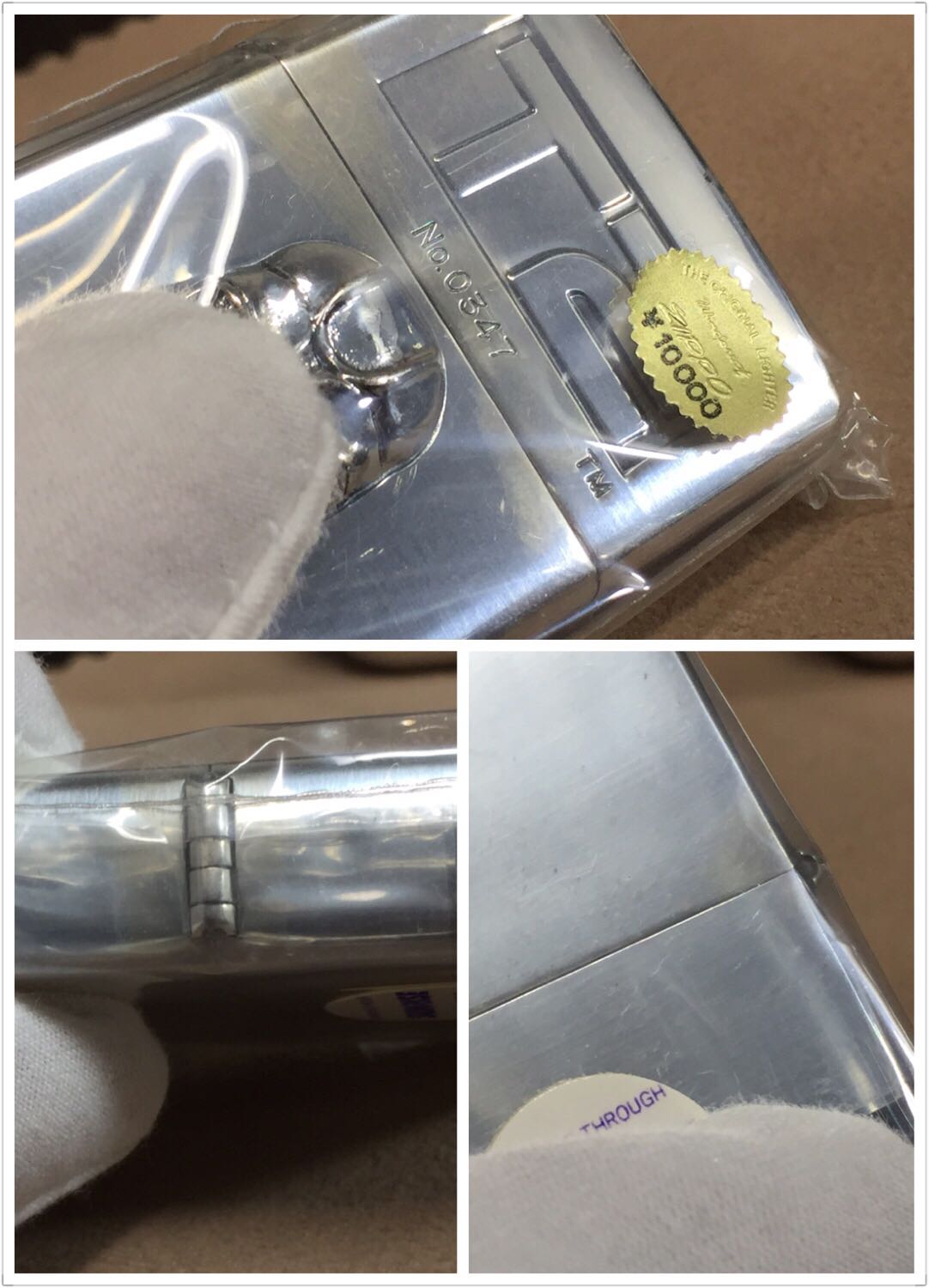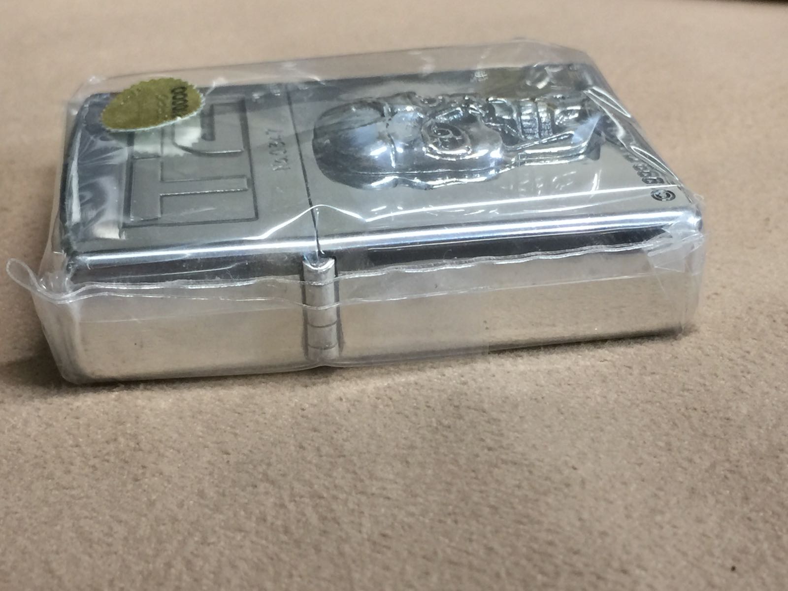【具体描述】全新1999年10月 终结者2 审判日 限量镀银机,本机编号0347。镀银底板蚀刻+精美合金贴章工艺。机身镀层轻微氧化(合盖处边缘:正面+铰链侧+背面少许)微距拍出,袋内有少量火石风化的灰尘溢出,定义全新一般品。因未开封,不拍摄内胆照片。原盒原说(铁盒一处浅凹,局部很轻微锈迹)