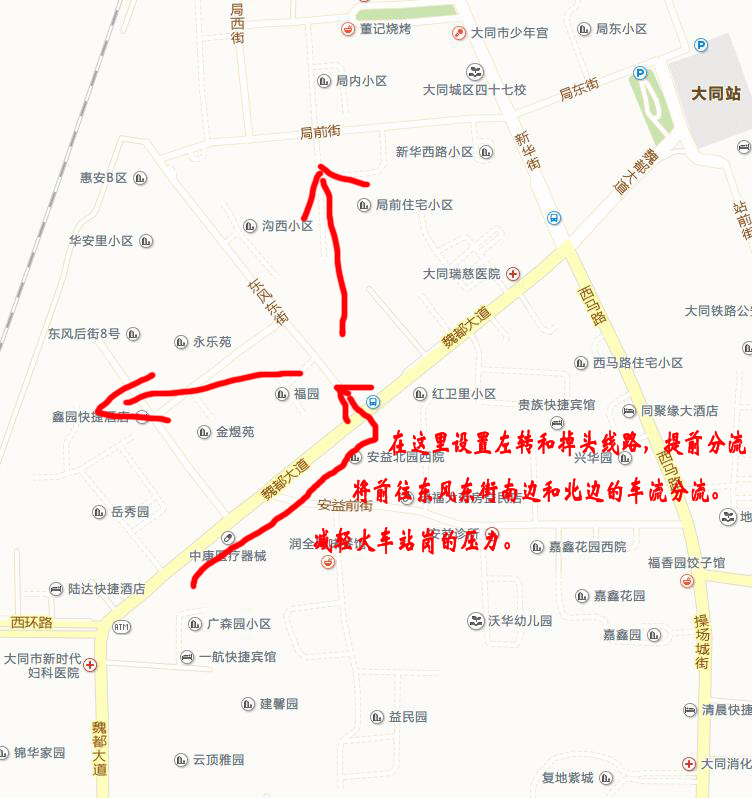 火车站岗的拥堵情况在大同是比较有名的,我通过分析得出,应该打开魏都大道与东风东街交叉点,容许从南面来自魏都大道和西环路叠加车流前往岳秀园、东风东街附近福园小区,沟西小区,华安里等左转或者掉头。我们通过图可以看出,上面这些小区都是人口密集居民区,他们从南边回家,现有的条件只能是到火车站掉头才能实现的。